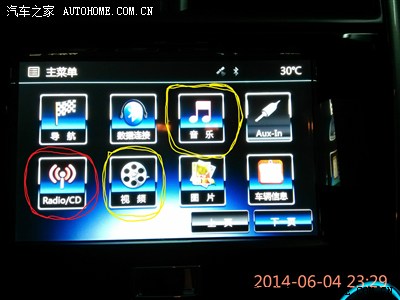 先说说黄线里的,这个使用的是手套箱里的USB/SD卡接口,功能比较多,但易用性较差,开机不能自动播放,必须点进来后才能播放。但是这个可以播放APE、FLAC等无损音频,可以实现歌词同步。另外要使用视频的功能也必须使用手...