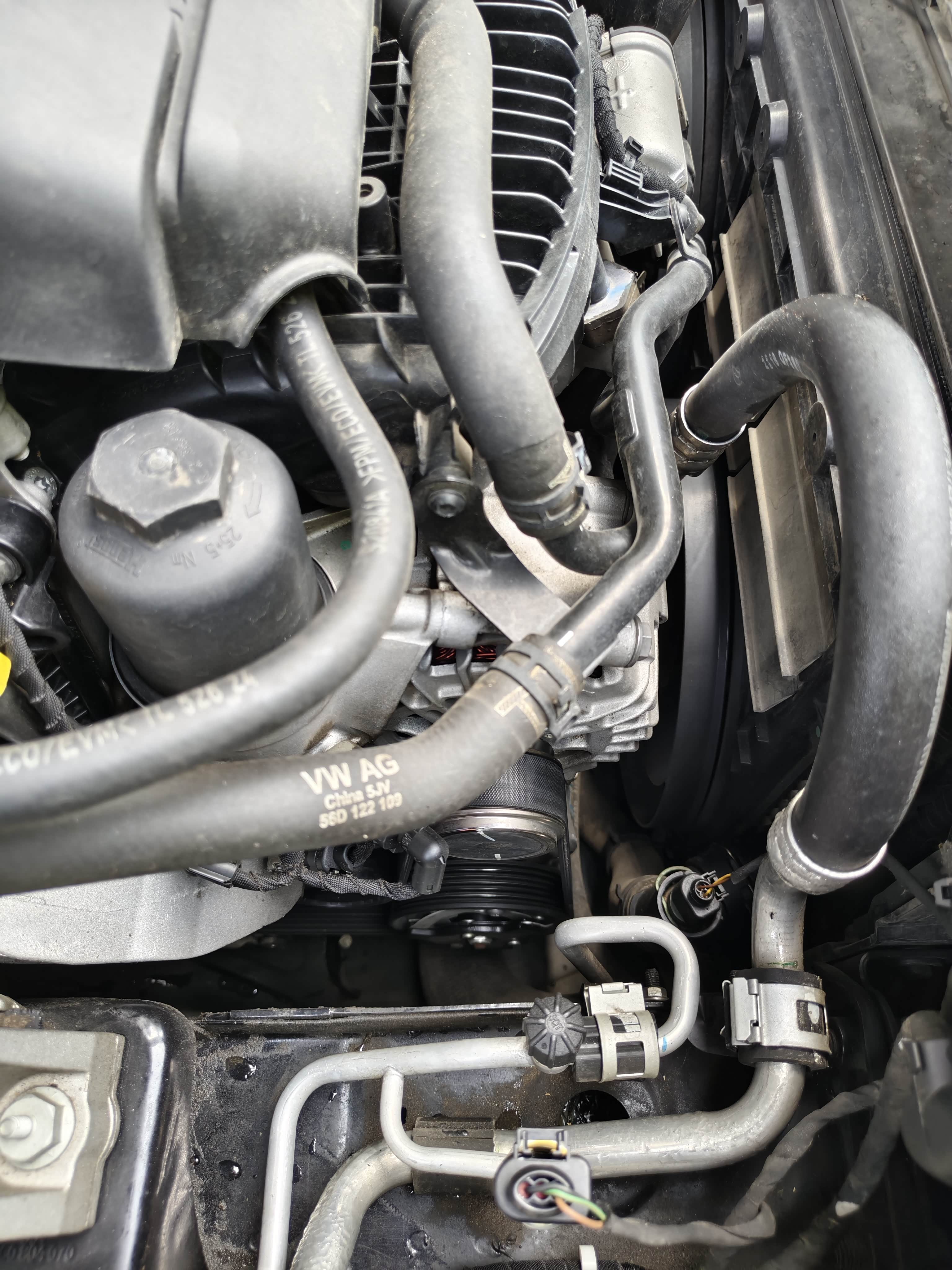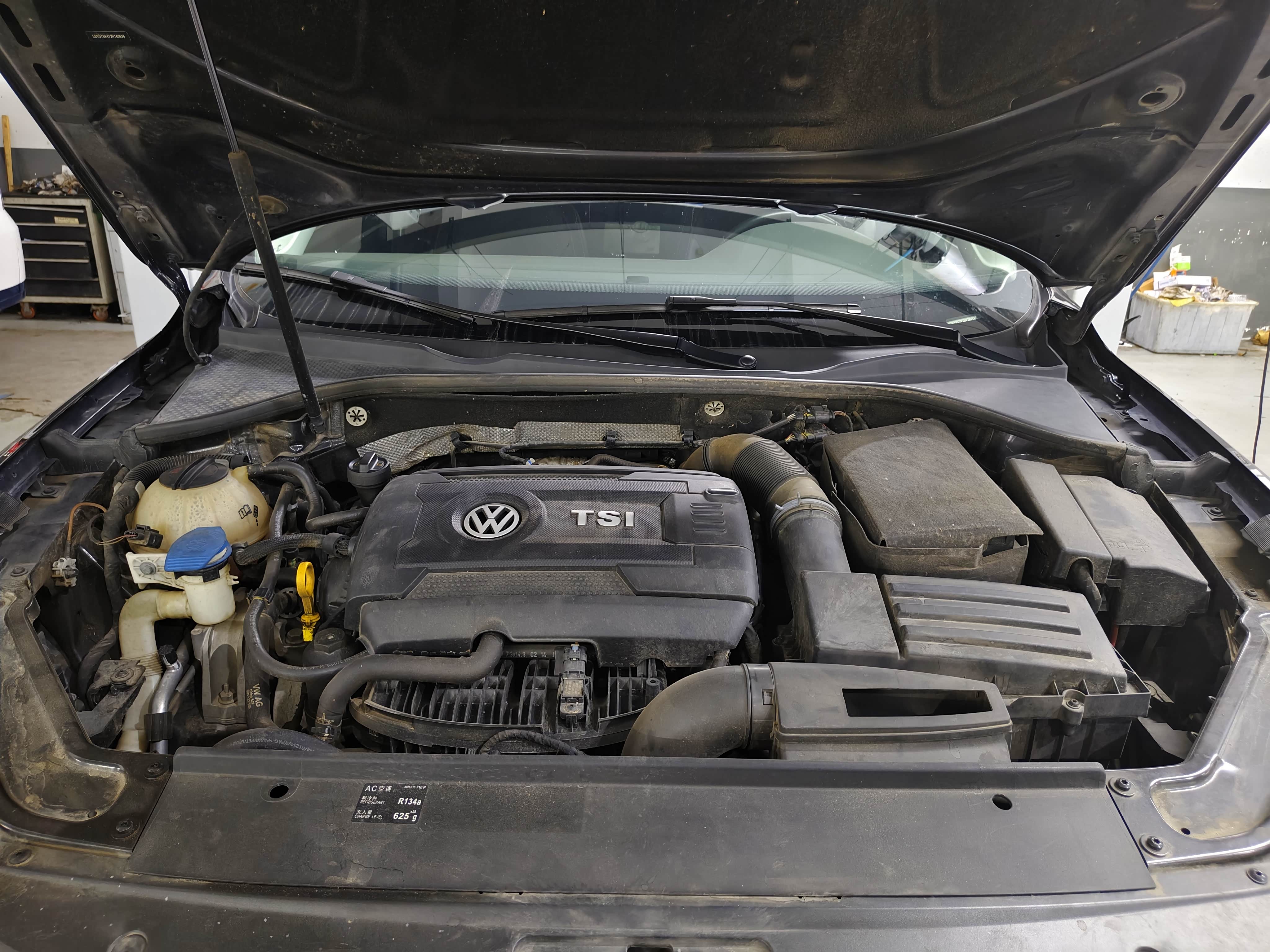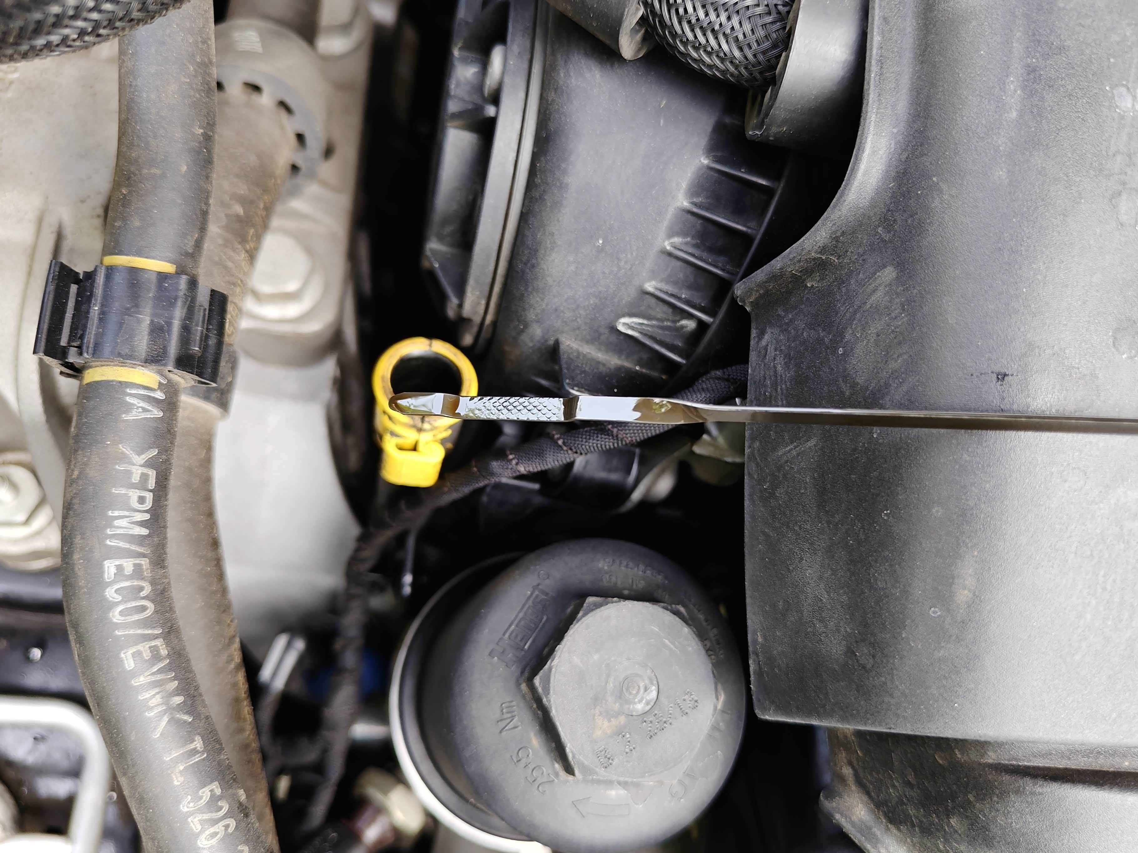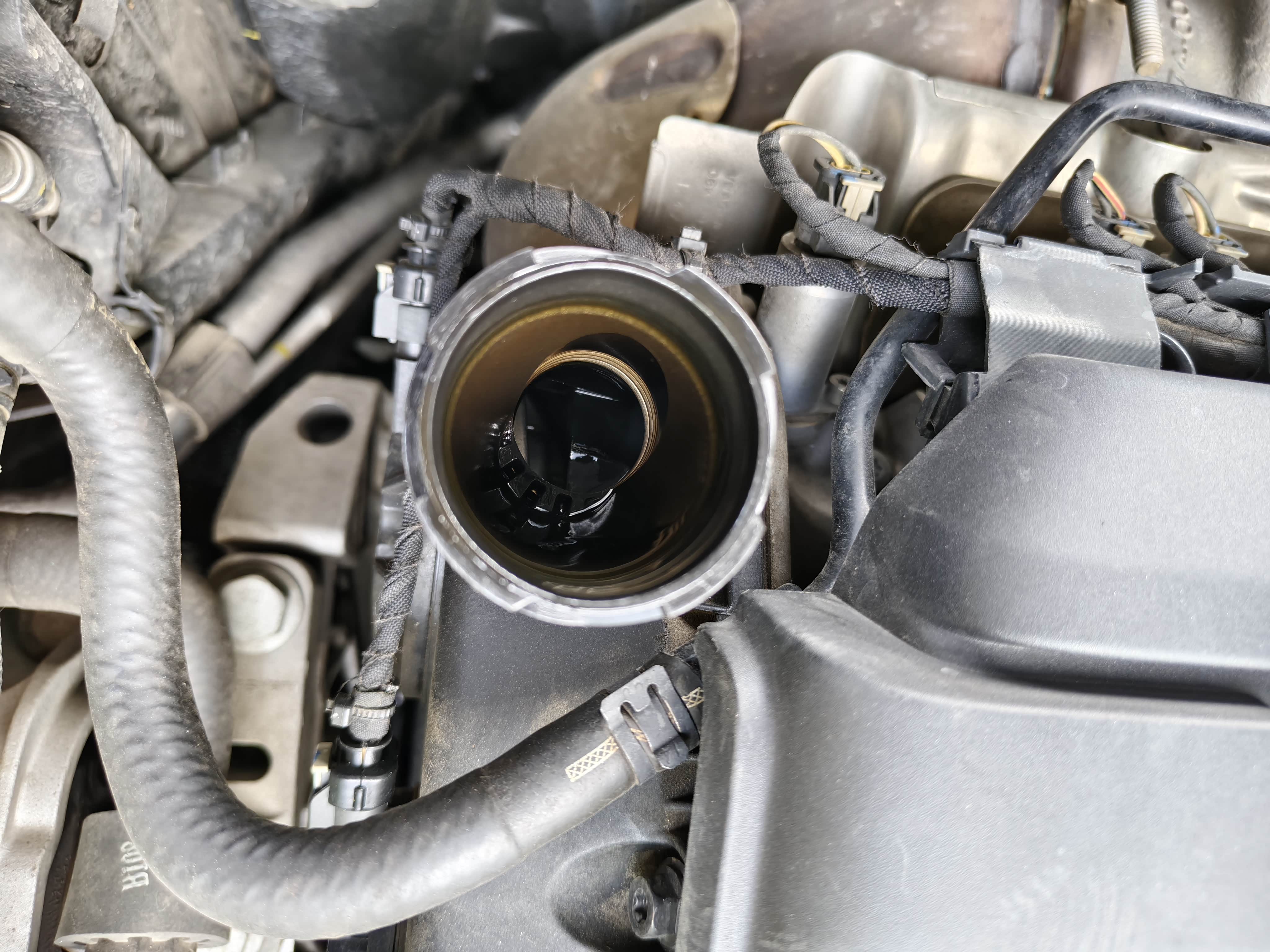 接着打开机舱盖,因为机油放不干净,每次都用机器在抽一升多机油,这样才能确保将油液更换的彻底,机油更换相对简单,总结就是放出旧机油,倒入新机油,EA888的机油滤芯在正上方,更换起来非常轻松。