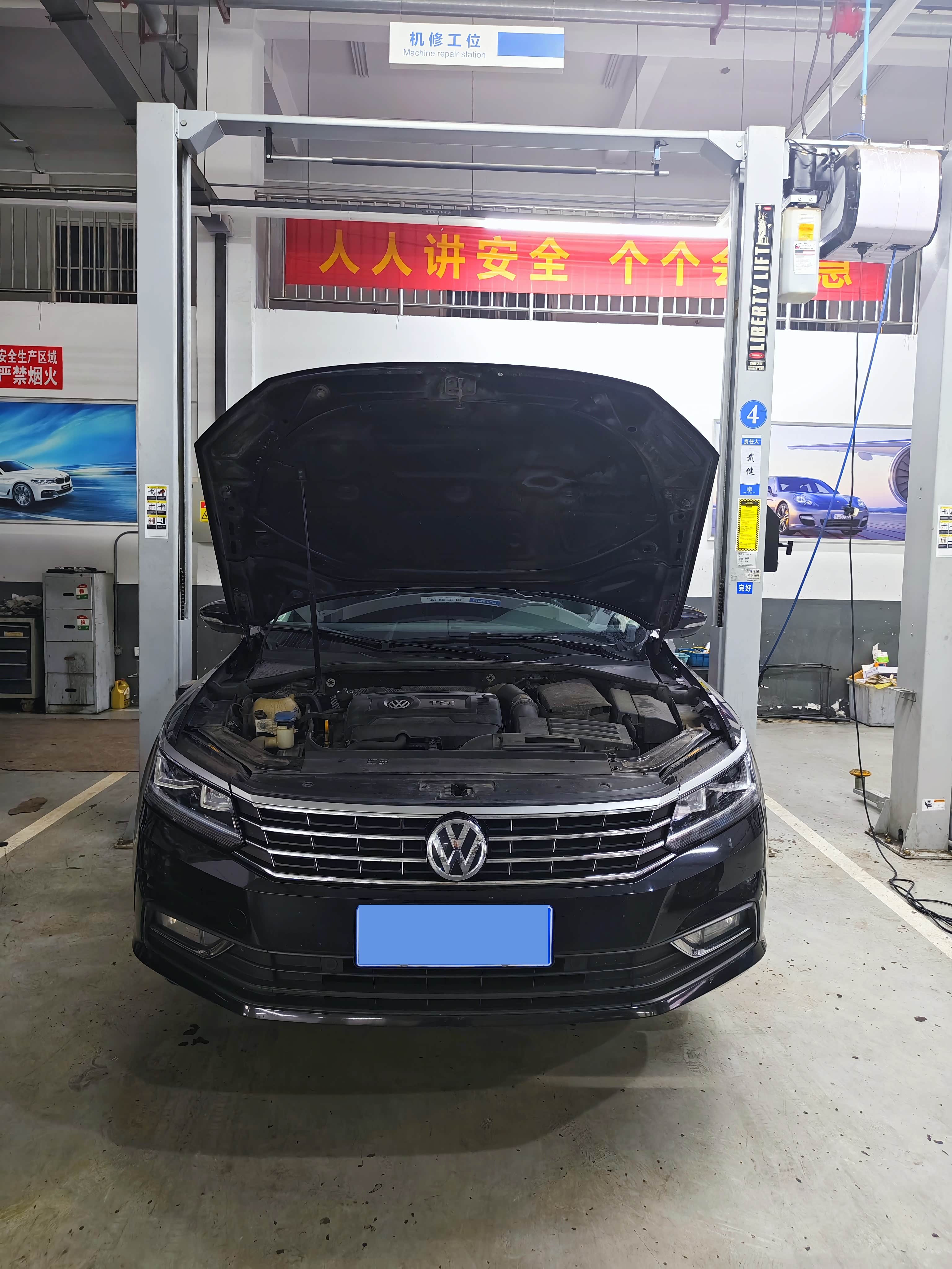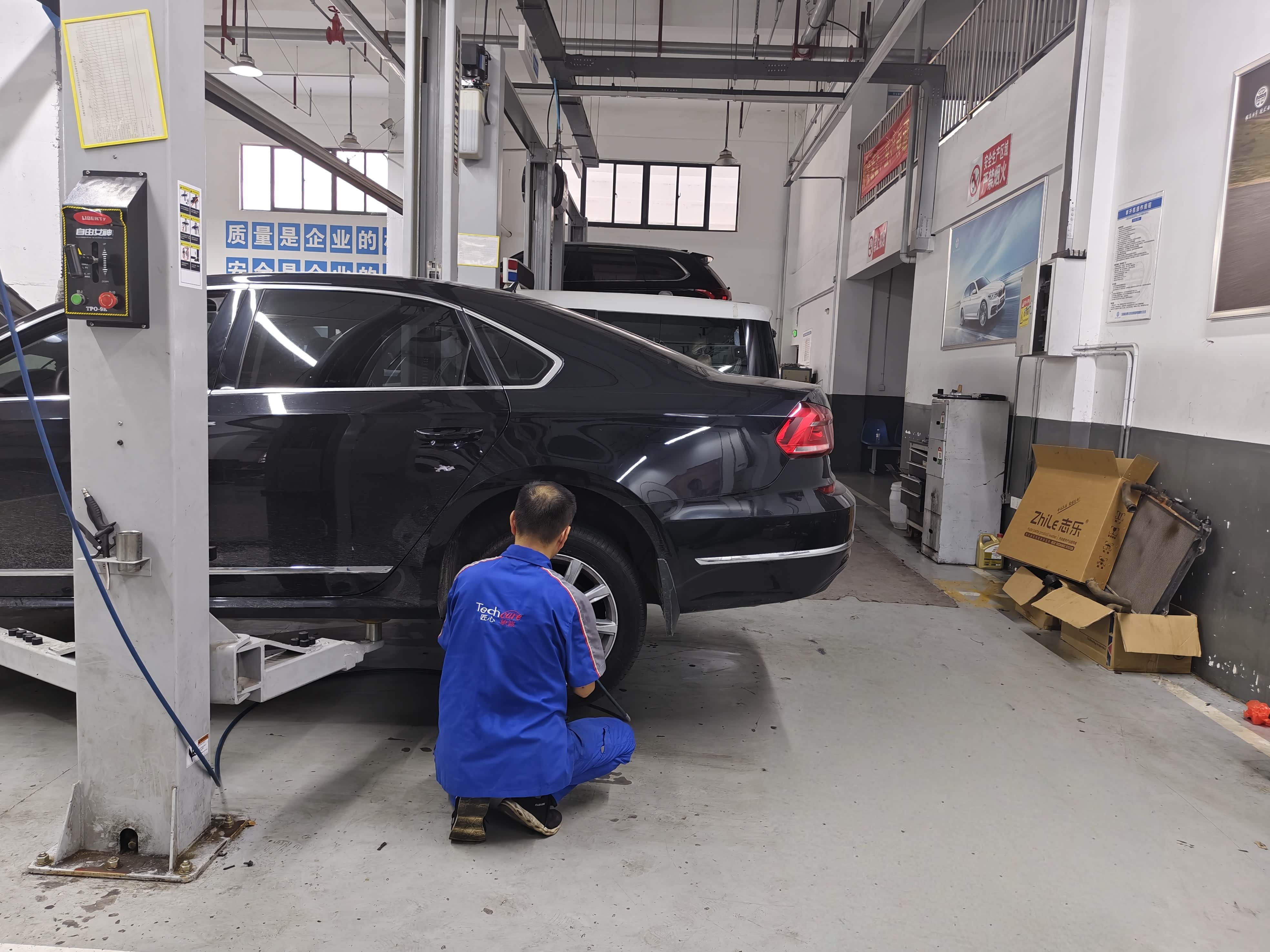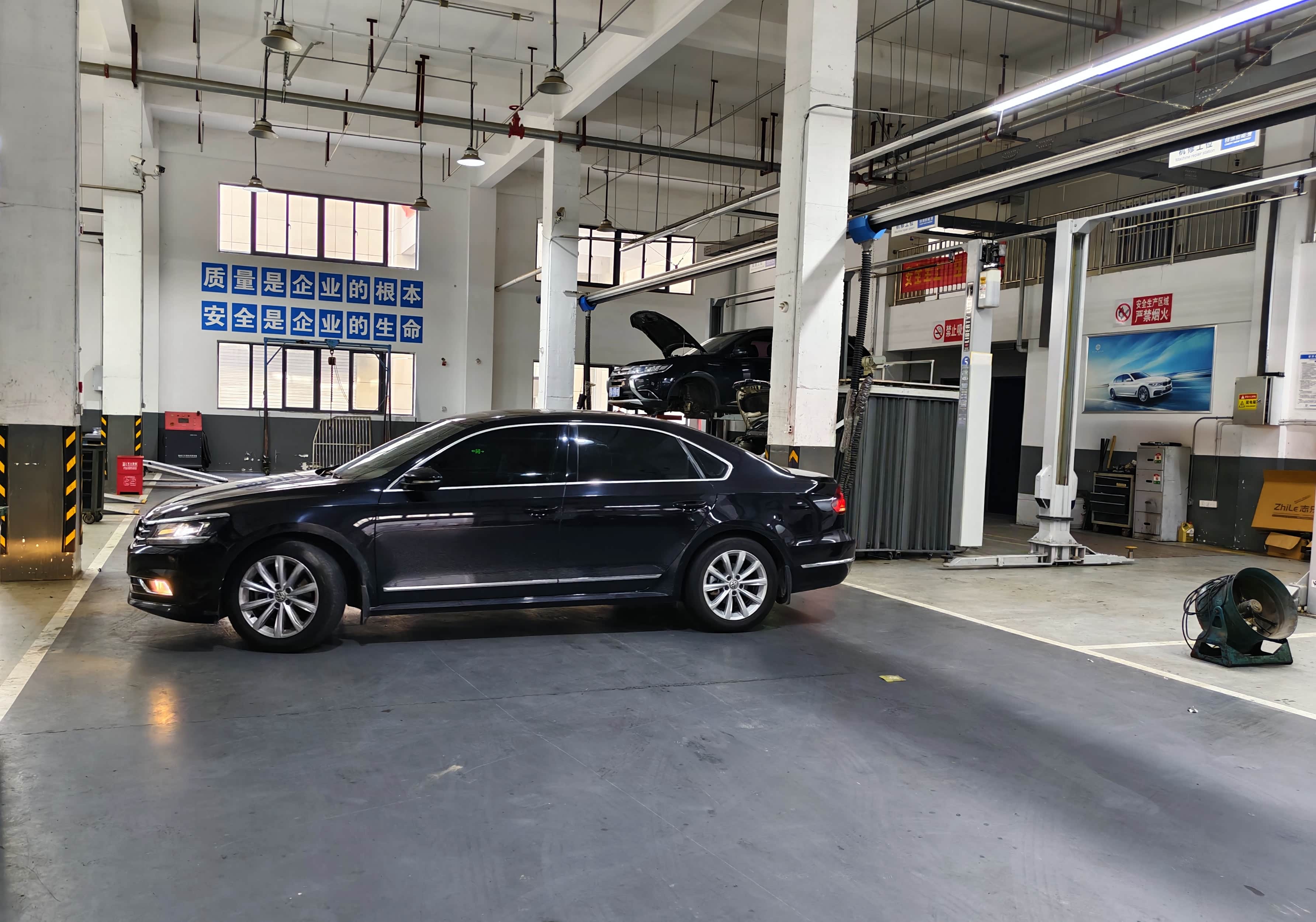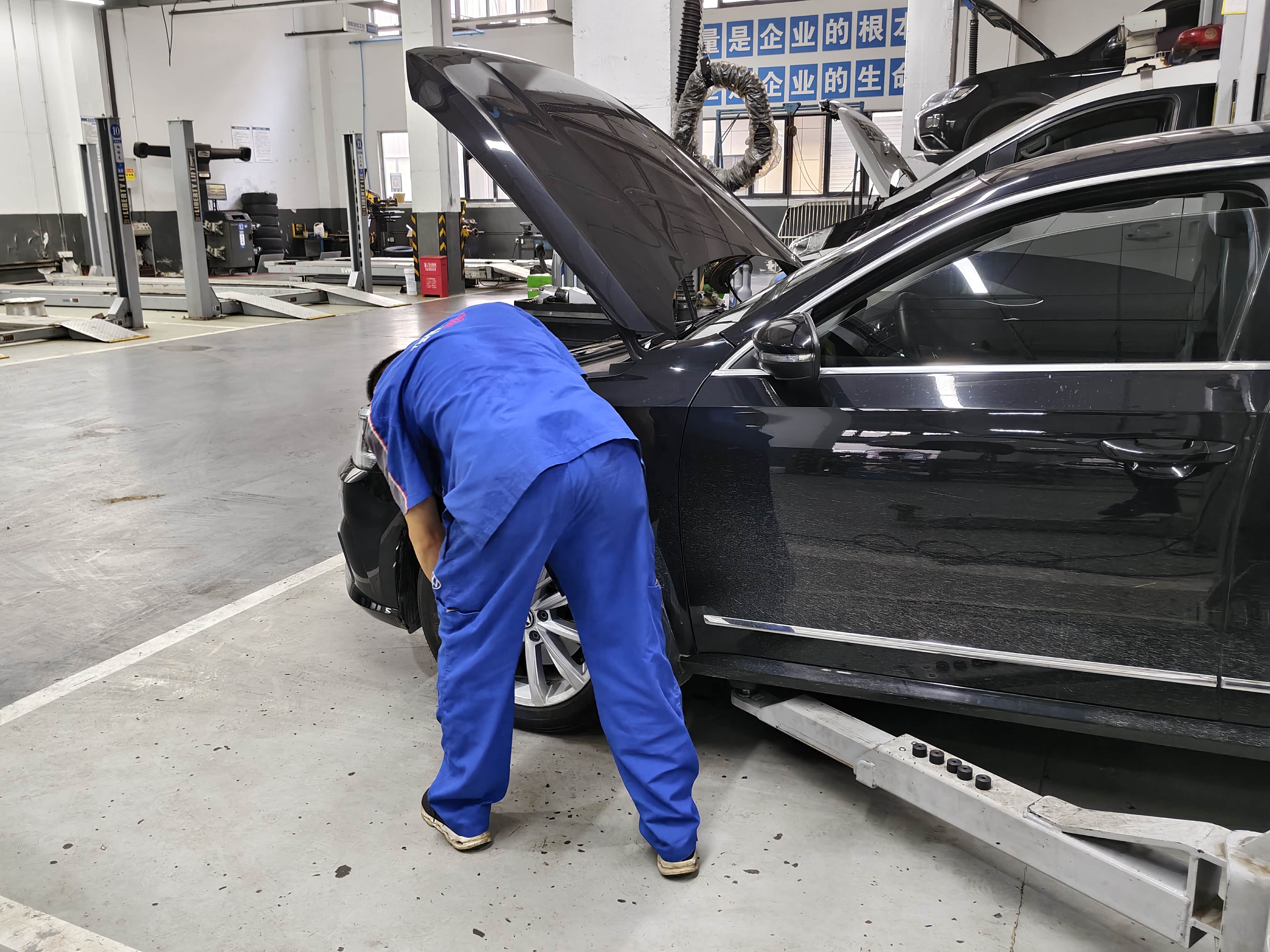 来的早不如来得巧,到店后车辆不多,与前台交接好保养事项,售后顾问把车开上保养工位,因为上次更换了空气滤芯和空调滤,本次做的就是常规小保养,包含更换机油(机油滤芯)、清洁空气滤芯、四条轮胎X形换位、检查怠速开空调车厢内异味。