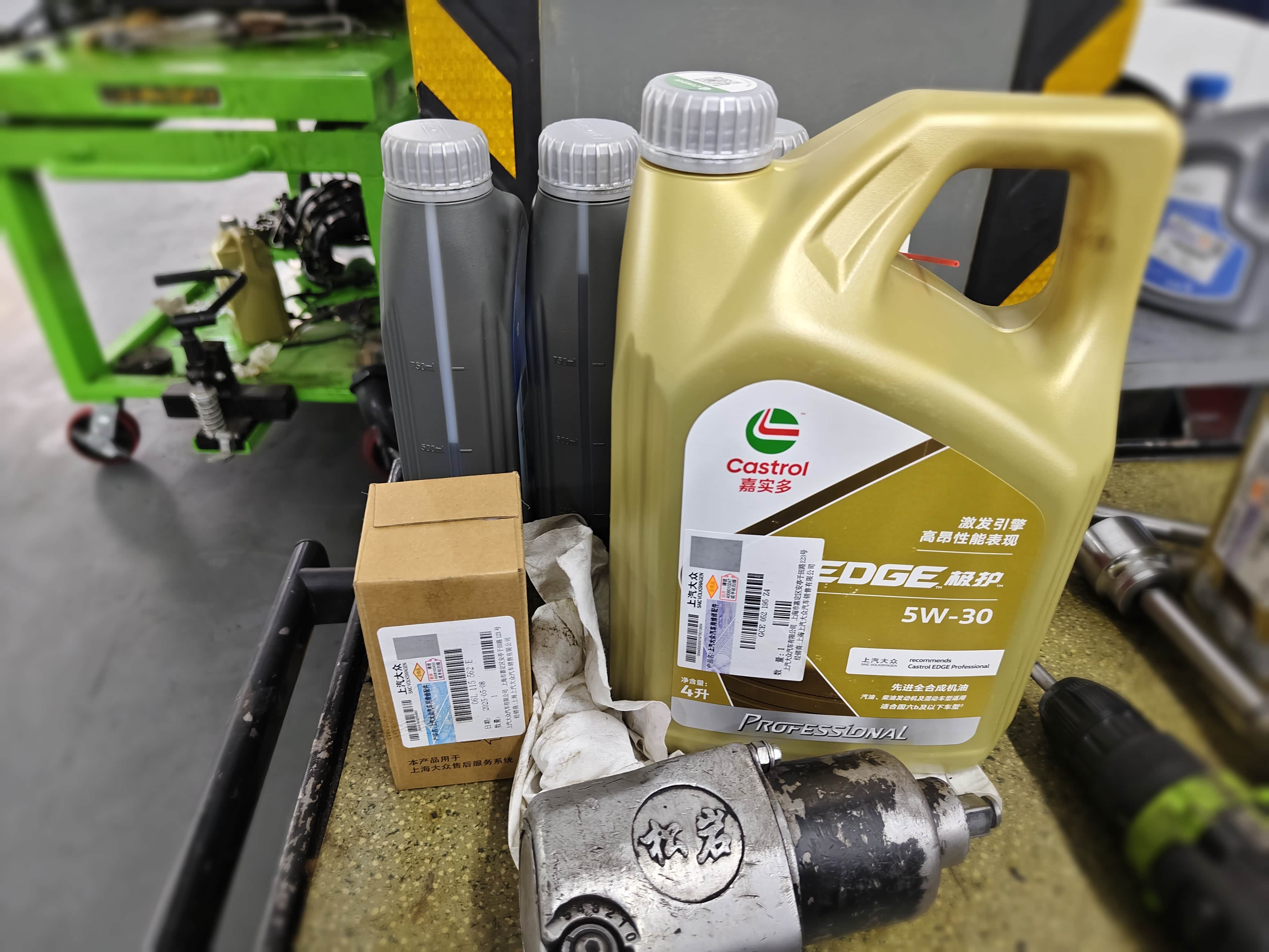小保养其实自己在家也能做,所需的工具包括抽油机、扭矩扳手以及6L嘉实多机油和机油滤芯,等到保养套餐用完后,我也准备自己网购机油保养。