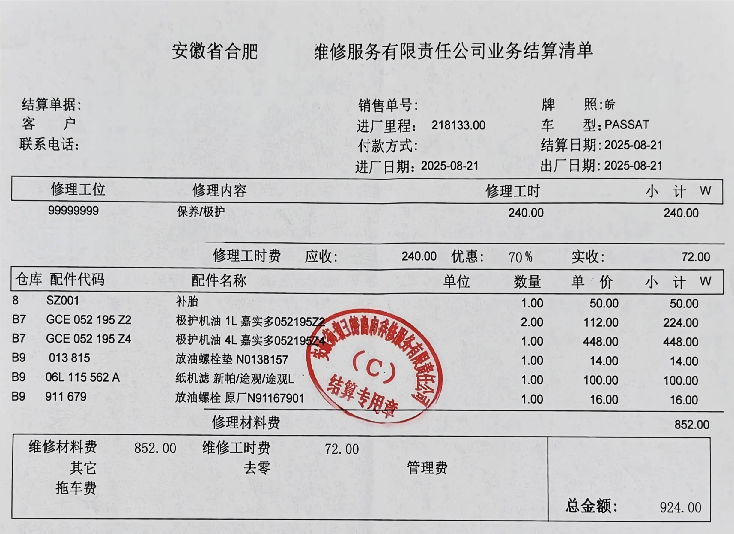 本次保养使用6升嘉实多5W-30全合成机油,以及原厂的机油滤芯和螺栓垫片,轮胎换位收了个补胎的费用50元,加上保养工时费一共924元。