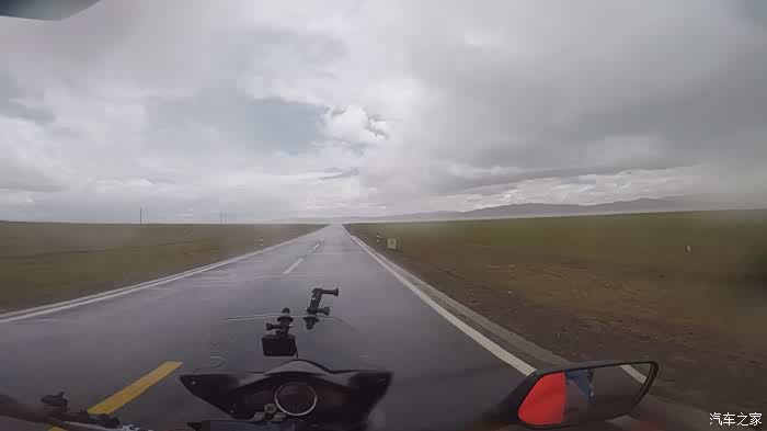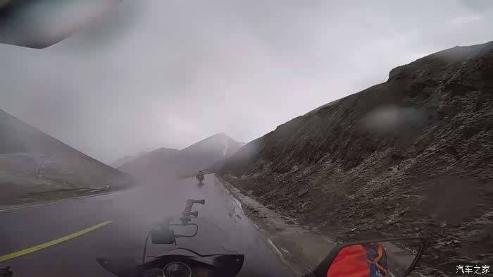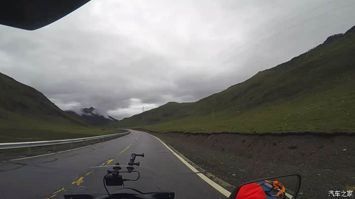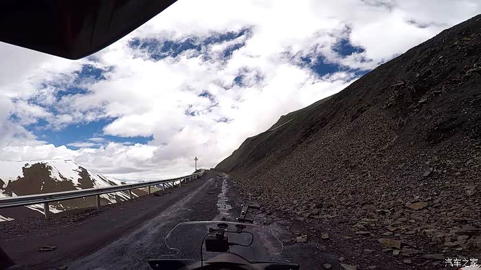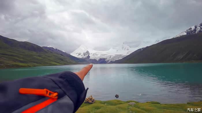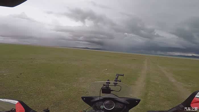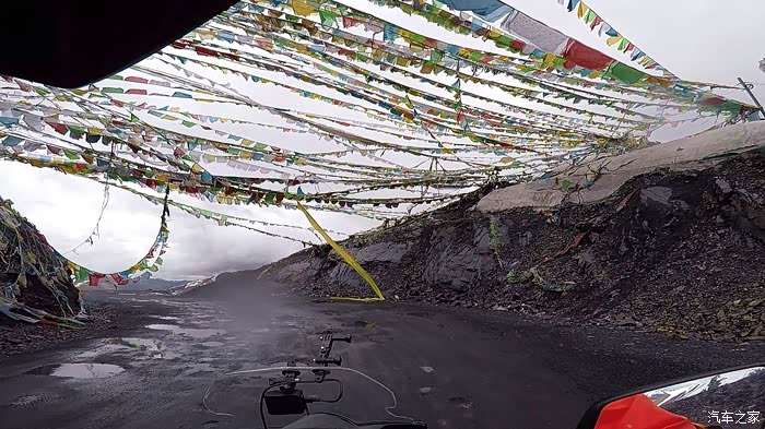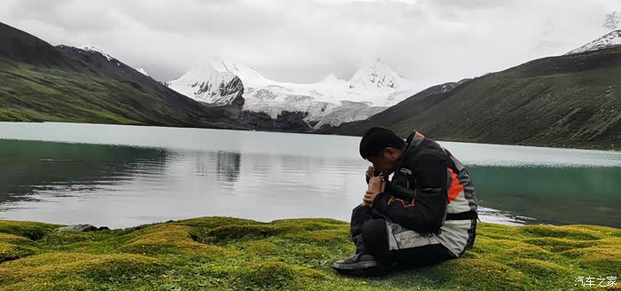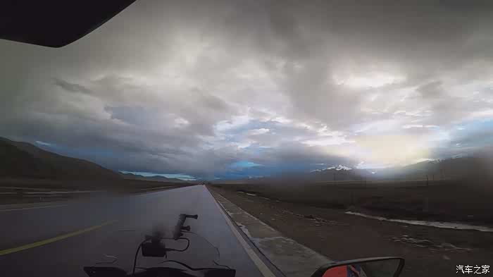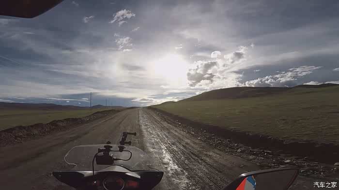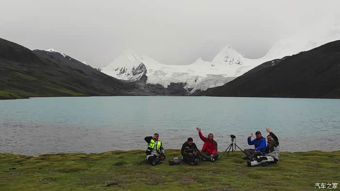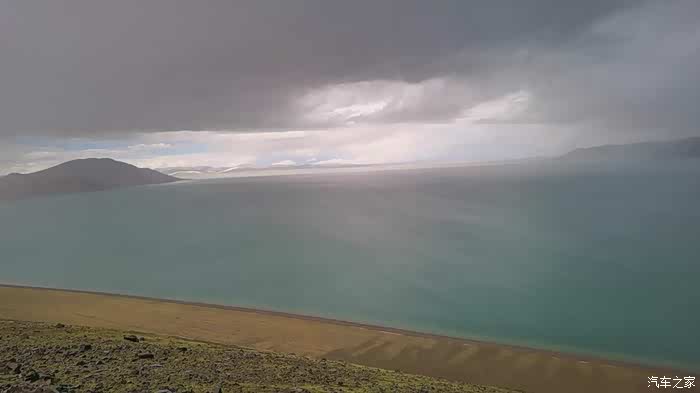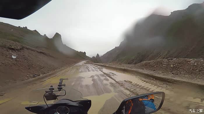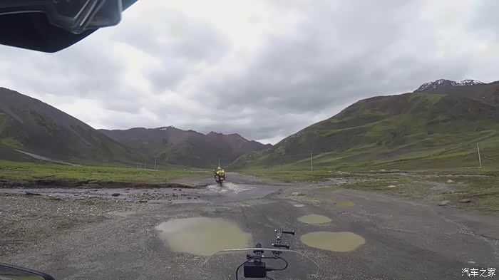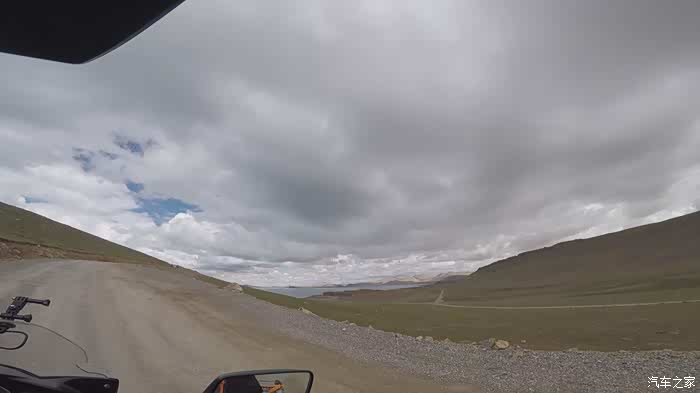 今天我们总共经历了三场冰雹,其中最大的一场冰雹中发生了一件可以让我吹一辈子牛的事,什么骑摩托车进藏?都不足以让我吹一辈子牛,你们可以想象一下会是什么样的事?旅行结束后我会揭秘。这一路真是风云变幻莫测,时而电闪雷鸣,时而晴空万里,今天的平均海拔在4500。沿途景色是我这次旅行中最美的一天,这里特别强调一下,在我们离一号目标也就是圣象天门还有100公里的时候,路边有一个不知道名字的错,当时天空还下着雨,而且风特别大,哪里刚修建了一个观景台,我们把车停上去,等了大约半个小时,乌云散去,那一刻,那个湖水泛着淡绿色,真的是特别漂亮。