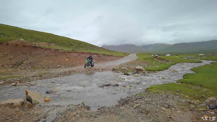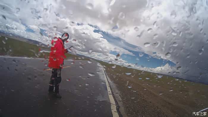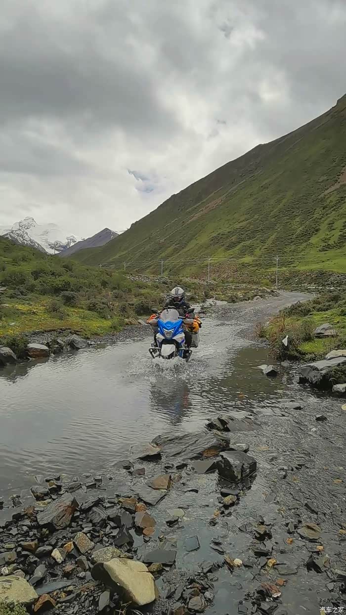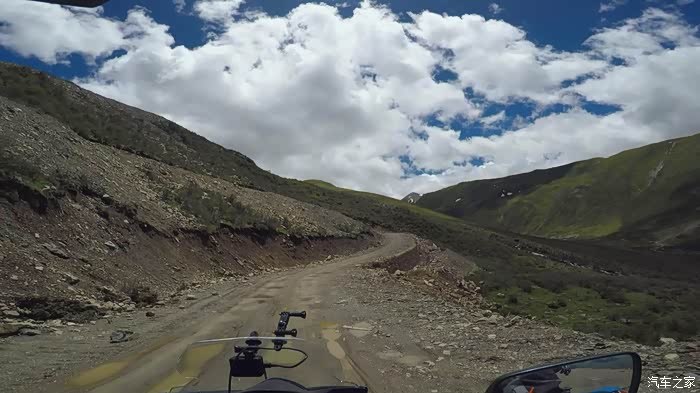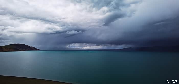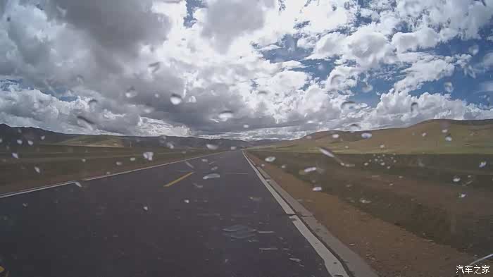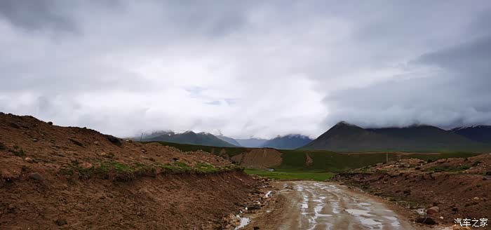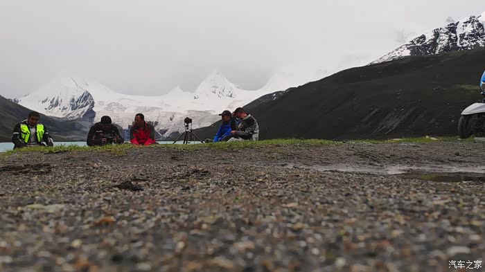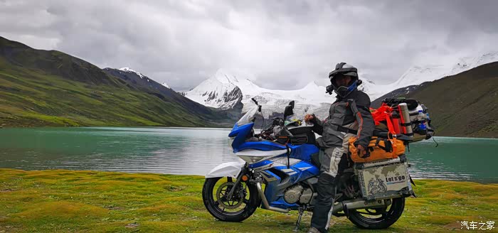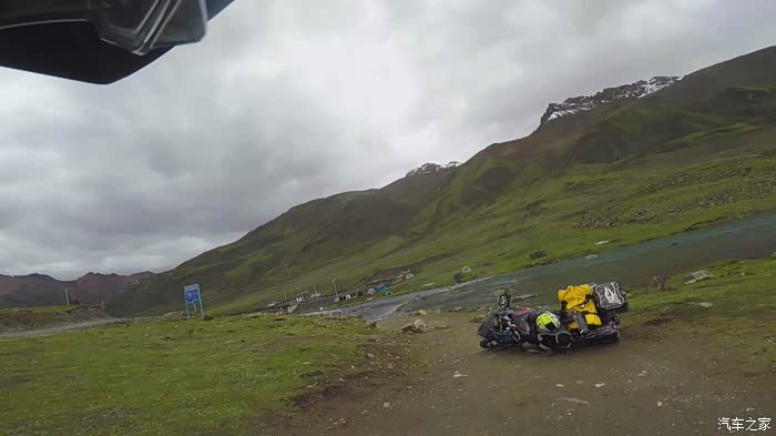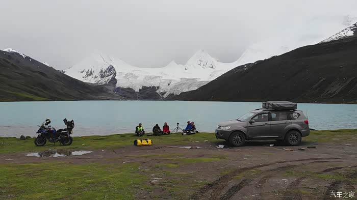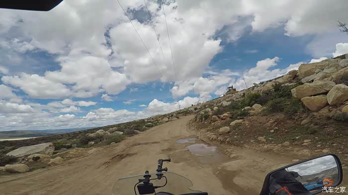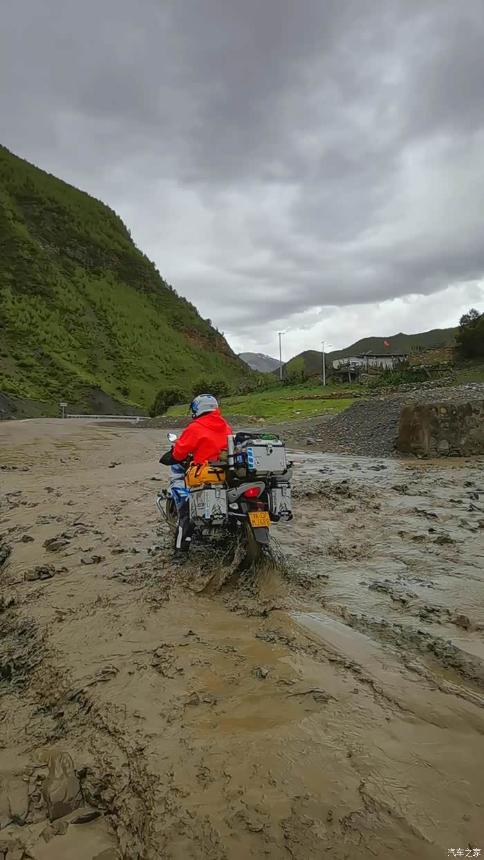 今天我们总共经历了三场冰雹,其中最大的一场冰雹中发生了一件可以让我吹一辈子牛的事,什么骑摩托车进藏?都不足以让我吹一辈子牛,你们可以想象一下会是什么样的事?旅行结束后我会揭秘。这一路真是风云变幻莫测,时而电闪雷鸣,时而晴空万里,今天的平均海拔在4500。沿途景色是我这次旅行中最美的一天,这里特别强调一下,在我们离一号目标也就是圣象天门还有100公里的时候,路边有一个不知道名字的错,当时天空还下着雨,而且风特别大,哪里刚修建了一个观景台,我们把车停上去,等了大约半个小时,乌云散去,那一刻,那个湖水泛着淡绿色,真的是特别漂亮。