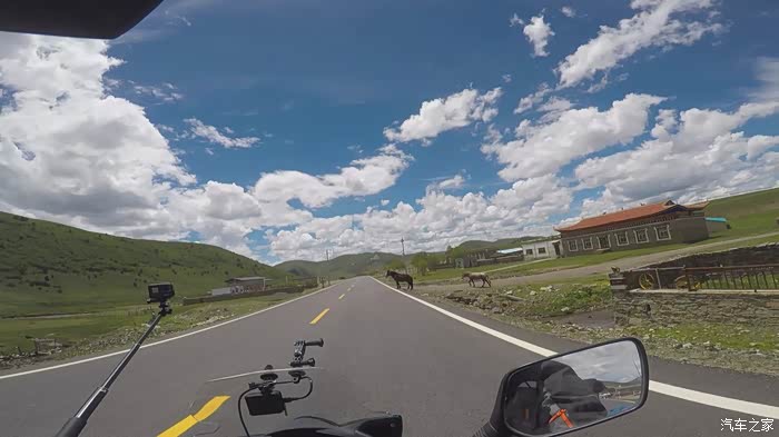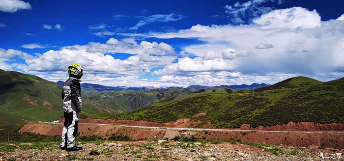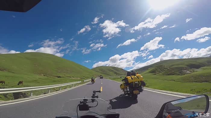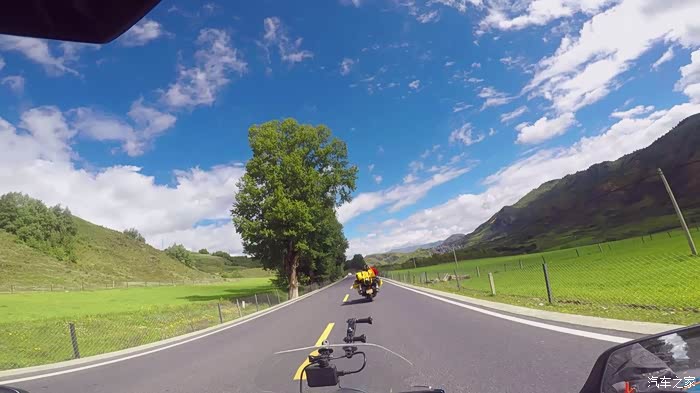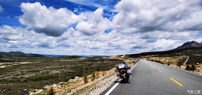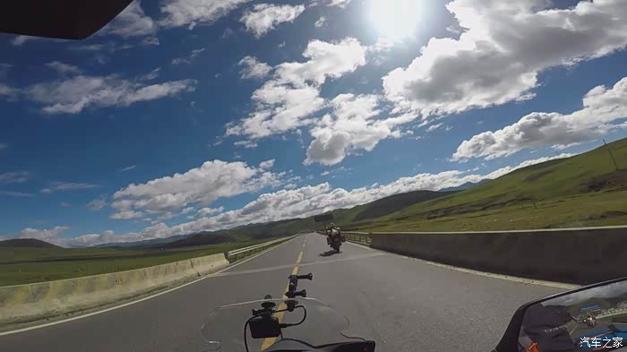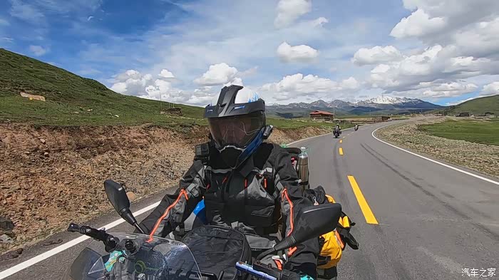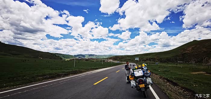 离开折多山观景台我们也就正式告别了318,走机场路往塔公镇走,这一路的景色真的真的真的太美了,好久都没见过那么蓝的天那么白的云,一路上我们不停的拍,各种机位,各种摄像机拍摄。离开折多山观景台不远,感觉路上的景色太美,我们就停下来拍照,拍完走了没有多远,结果遇上修路的,我把车停下,立马走到挡路人跟前,不管人家抽不抽烟,先给发了一根烟,然后问他摩托车能不能过去,挡道的人说摩托车可以过,注意安全,于是我们顺利通过,走到半路,修路机械把路堵得死死地,我正犹豫该怎么办,想着是不是挡道的人骗了我们时,旁边一个修路的师傅告诉我,往回走一点,有个岔路口,走小路可以绕过,后来我们就顺利按照他的指引,把这段路绕过去了,基本上沿途景色都差不多多,很美。