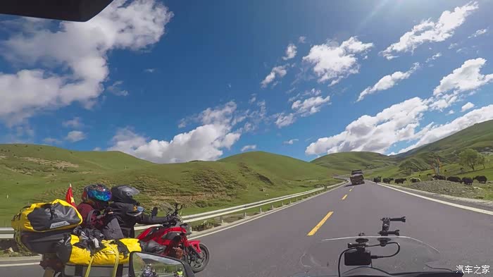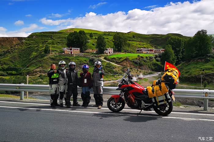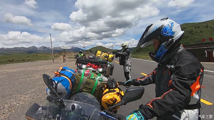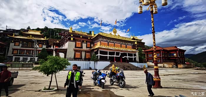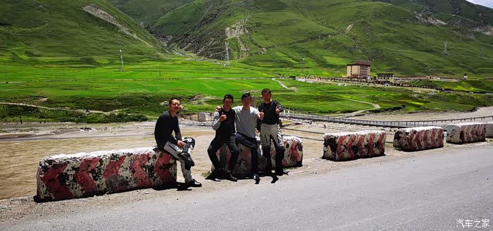 今早七点半起床,广东的摩友c的妻子给我们做了早点,煮的面条,吃过之后我们就一起出发,到了八美与他们合影后分开了,他要去马尔康,后来听说他那一路遇上了泥石流堵车厉害,我们走道孚、炉霍,最后在卡萨湖安营扎寨,我们这一路也有修路路段,不过对摩托车影响不大,刚出八美,就遇上修路,路被封了,我们把摩托车停在最前面,一打听,他们十二点才放行,这时才十点多,结果遇到几辆特殊小车要通行,我们就跟着小车一起走了。走了十几公里烂路,就基本上一直都是好路,可能就是因为封路的原因,一路上车特别少。