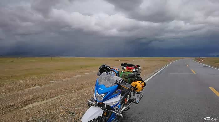 下来之后我们找了路边一家拉面馆,由于当时已经两点了,我两早上到现在啥都没吃,点了一盘炒羊肉片,居然120,我们没吃完,剩下的打包,打算晚上在吃,可惜当我们到目的地的时候,发现被蛋丢了…从丁青往索县的路,非常棒,雪山,蓝天,白云一路相伴。打开蓝牙耳机,听着自己喜欢的音乐,那一刻感觉特别舒服,只有自己能够懂,然而,好景不长,眼前打雷闪电,乌云密布,我紧穿慢穿雨衣,都被冰雹袭击,把我撒打的疼的,于是立马带上头盔,然后在穿雨衣(我的这身雨衣,16年进藏的时候买的,后来每次出远门都带着,可是从来没穿过,今天算是第一次穿了,也算是开封了),骑了100米,雨大的根本看不见路,正好找了一个过道,我两立马进去躲雨。大约20分钟后雨过去了,我们继续前行,大约跑了30分钟,在路边偶遇西安一摩友,杨哥,他318进,317唐潘古道回。闲聊才知道,他是87年的青藏线的汽车兵,青藏线跑过无数次,这次是回来看他的几位战友的,30年了,他一直不敢回来,过不了心里那个坎,他说:你不知道,我在东达山哭的不成样子。那一刻我有种莫名其妙的伤感,我心想,他一定有很多故事不为人知。我们互加了微信,约定回了西安,约一下好好聊聊。