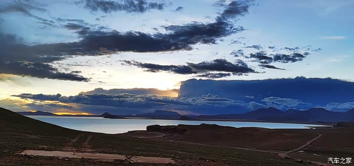 离圣象天门大约50公里时,开始是沙石路况,特别烂,还剩十几公里时可以看到纳木错,湖水很蓝很漂亮,只是我们着急想先到景区里面去,当我们到达景区门口时已经八点半了,看门的藏族小伙死活不让我们进去,我就坐在他们的帐篷里烤火,里面还有两个藏族小姑娘,我说我太冷了,烤烤火可以吗?他们倒是热情,只要不让他们违反原则,啥都好说,他问我们喝不喝热水,我们就顺便用他们的热水泡了方便吃了,吃完面无意中看到了纳木错的晚霞,我立马抓拍两张。后来我们在一处藏民的帐篷旁边打起了帐篷,起初藏民还不让我们搭他们旁边,怕我们偷他的羊,我们说只住一晚上,藏民就同意了。
