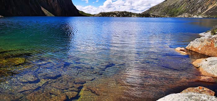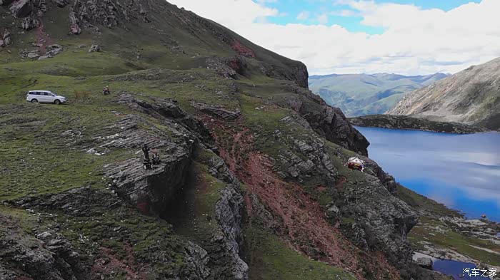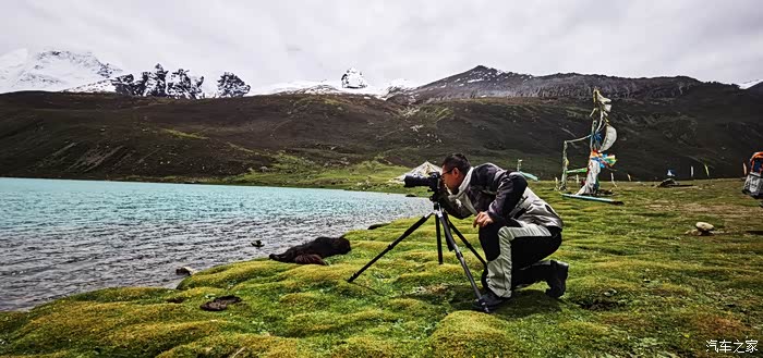 我们把车停好,大家开始各种拍,尤其是小J同志,一边拍视频,一边鄙视他的那些跑318的朋友,说什么318商业味太重,摩旅就要来这种原始的天然的等等…后来吃饭的时候,他更是调戏他们60多岁的群主,问他来过几个这样的地方,嚣张的样子何其了得,这伙计绝对是个有意思的人。我相对来说拍的少点,我们要步行走下去到湖边,这个走过程的时候我在担心怎么上来,后来短短几百米的路我硬是走了一个半小时。当走到湖边,更近距离接触湖水的时候,你才会发现湖水居然是那么的清澈,一眼望过去,湖水特别蓝,可能是因为天气好,天空蓝,所以湖水也蓝把。在湖边依旧各种各样的拍,而我,也毫不客气的把无人机的三块电池用的干干净净,一点不剩。