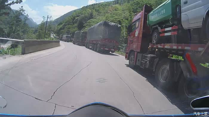 由于修路,318车不多,我们几个跑的也很兴奋,偶尔遇见几个对面过来的摩友,这也暗示着,此路可以走。只是刚出泸定不远,路边的大卡车就排起了长长的车队,都在路边静静的等候着放行。离泸定大约还有40公里的时候,路特别烂,会车的时候被堵住了,等了二十多分钟,Jl受不了,说不行上高速,我纠结了二分钟,实在不愿意上高速,可是我们还是掉头折返了四五公里,从喇叭河收费站上了高速,那个收费站特别冷清,只有一个小伙在收费,也没有刻意阻拦我们,只是对我们说交警会赶你们下高速的。我们礼貌的回复:没事,出了问题我们承担责任。就这样,我们上了高速,跑了30公里,我们就乖乖的下高速,结果在泸定收费站被警察蜀黍拦截,检查证件,差一点就是一百块3分没了,一个警察同志说:你们摩旅就要跑国道,国道的风景那么好,为啥上高速?yq礼貌的回复:我们也不想上高速,可是国道修路,堵了我们半天,实在没办法才上的,你们可以调监控看看,我们是不是从上一个收费站上来的,我们也是把高速压缩到最少的历程……交谈了七八分钟,我们动之以情晓之以理的诉说,最后警察同志被我们的真诚打动,口头教育警告后放行,并且警告我们别再上高速了。我们答复一定一定,就继续赶路。(我个人一点心得,出门在外态度一定要好,有理说理,有请说情,摆明立场)再次要为警察蜀黍点个赞。其实我们也本来真没打算上高速,真的是出于无奈。因为上了这段高速,他们两个错过了二郎山的风景, 我跑到,到无所谓了,不过后面的景色只会越来越美。