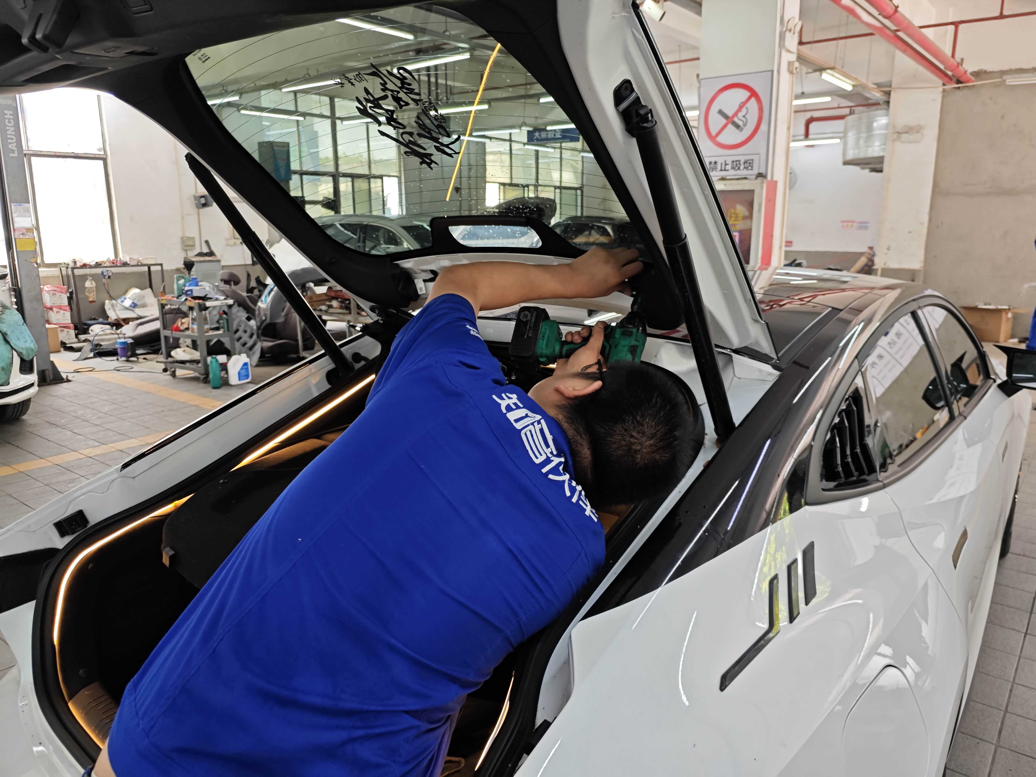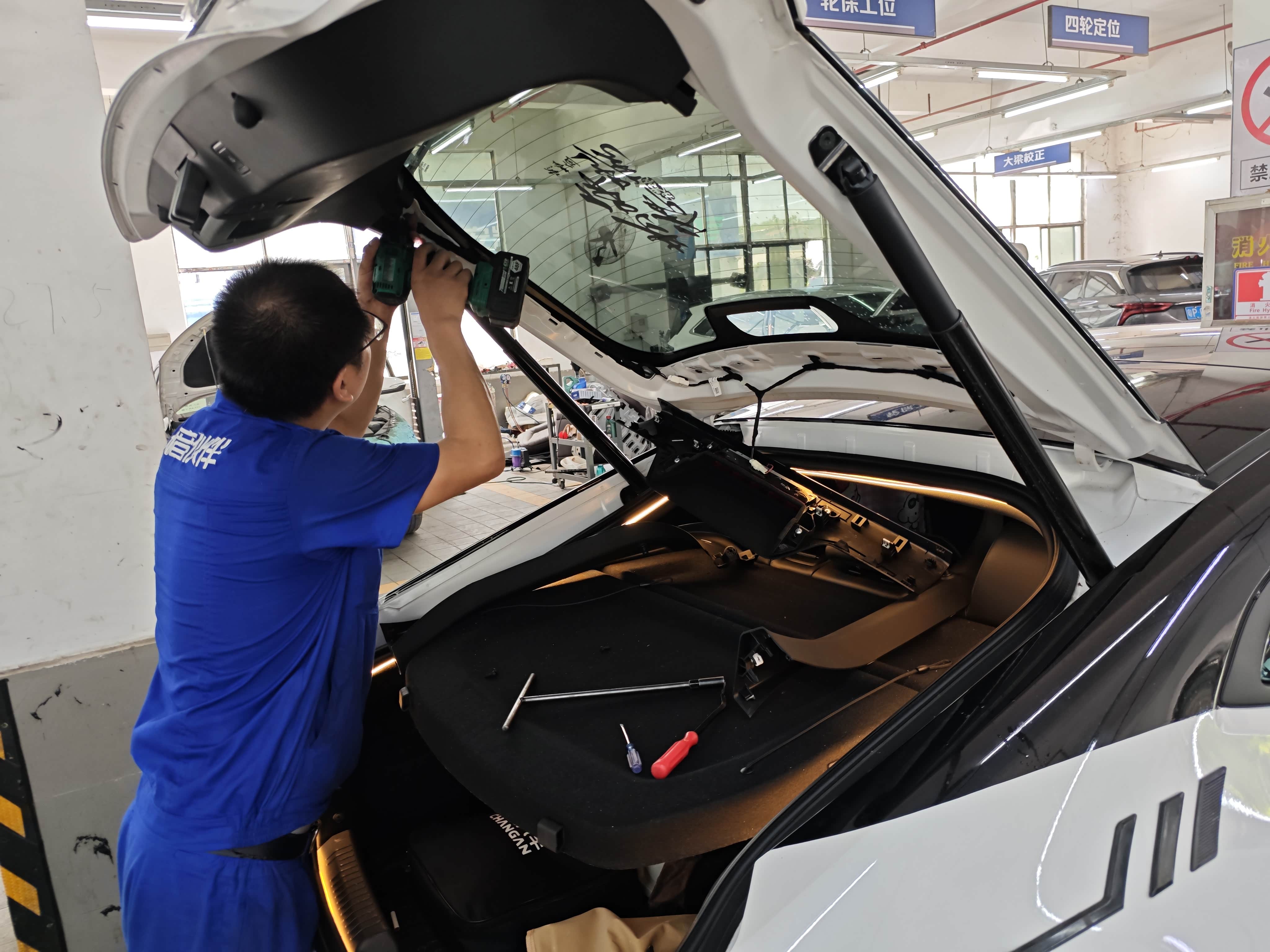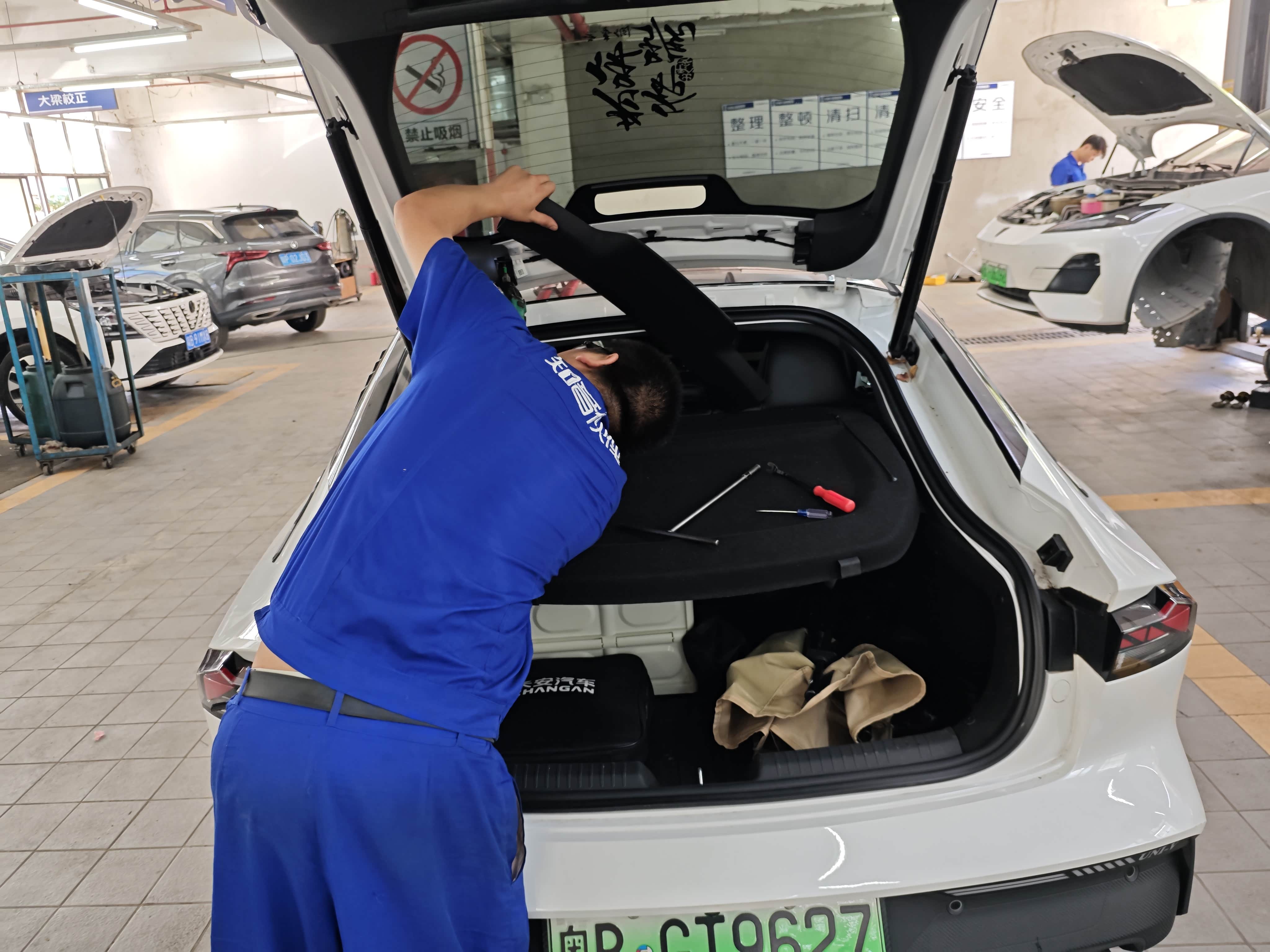 一位年轻的技师负责我的车辆。他先是仔细查看了旧车标的状况,然后用专业的工具,小心翼翼地从后尾箱门边缘开始拆卸旧车标总成。整个过程他都非常专注和轻柔,最大限度地避免对周围车漆造成任何划伤。取下旧车标总成后,接着,他拿出了全新的原厂后车标总成。在安装前,他反复比对了新件与原安装位的契合度。