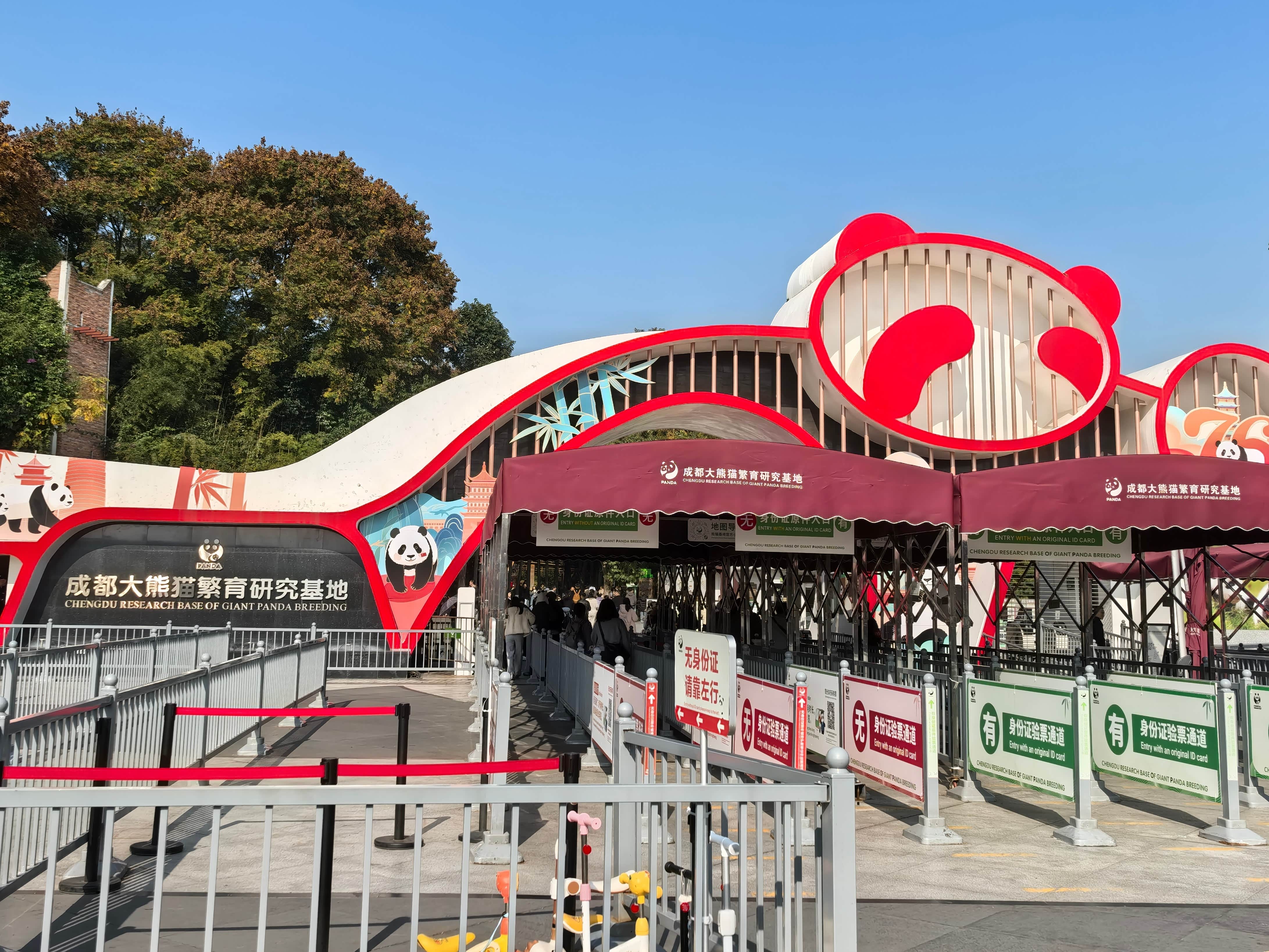 坐地铁3号线到熊猫大道站,A口出来换景区摆渡车,5分钟就到门口,比自驾方便(自驾停车场离入口有800米,带着娃走太累)。门票在小程序上订的,55元/人,1.2米以下免票,刷身份证就能进。
