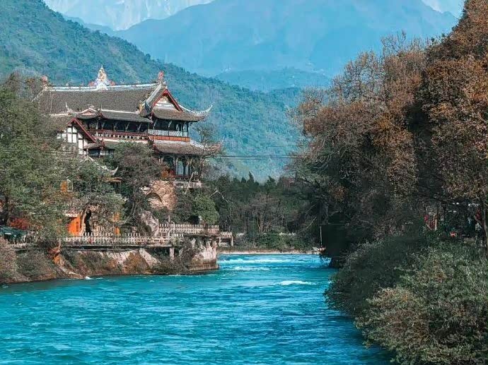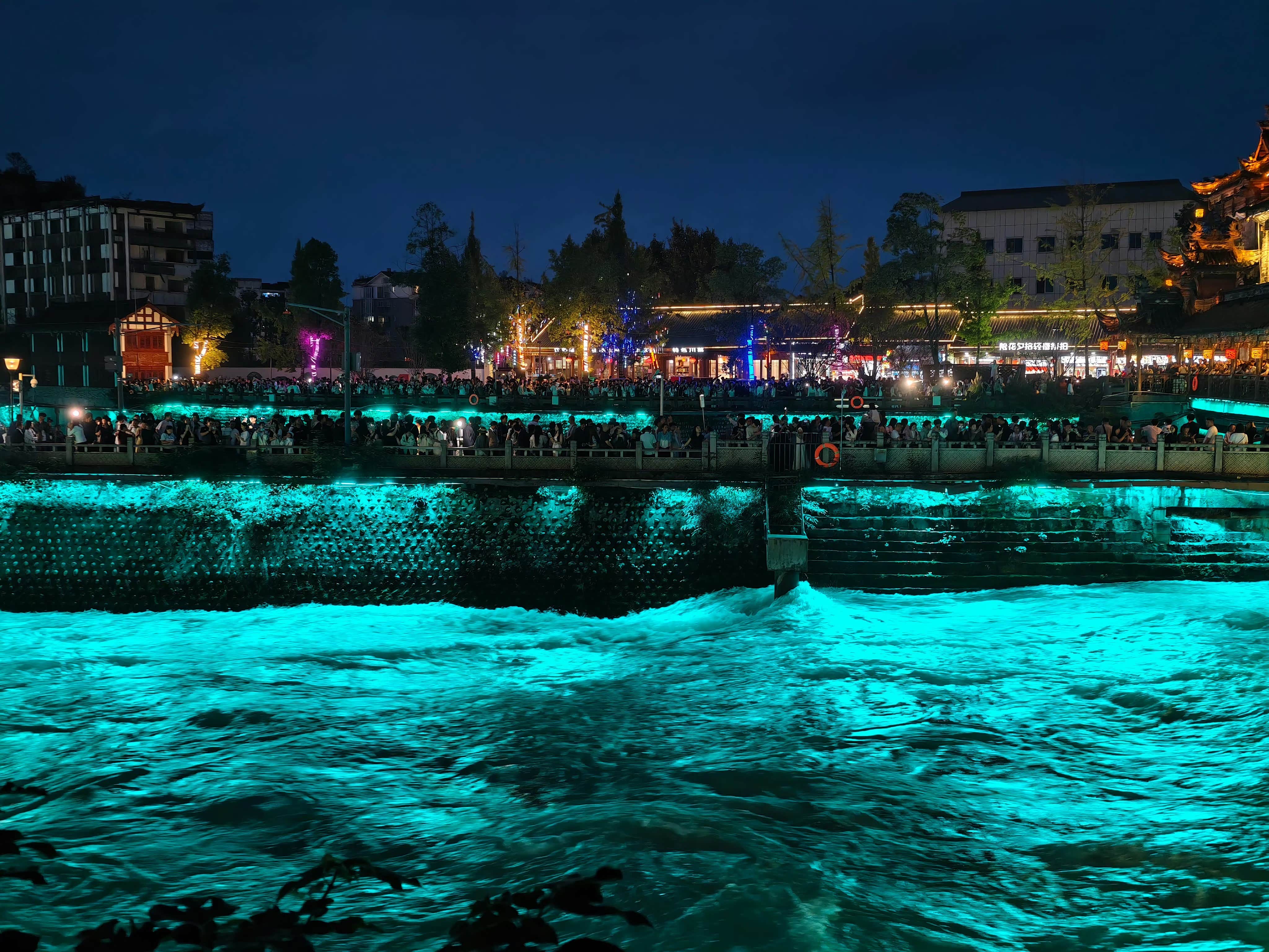 天黑前到了南桥,灯光一亮,岷江水变成了梦幻的蓝色,像流淌的星星。坐在桥边的石阶上,看游客拍照,听江水哗哗响,突然明白为什么成都叫“天府之国”——有山有水,有智慧,才有这国泰民安。
