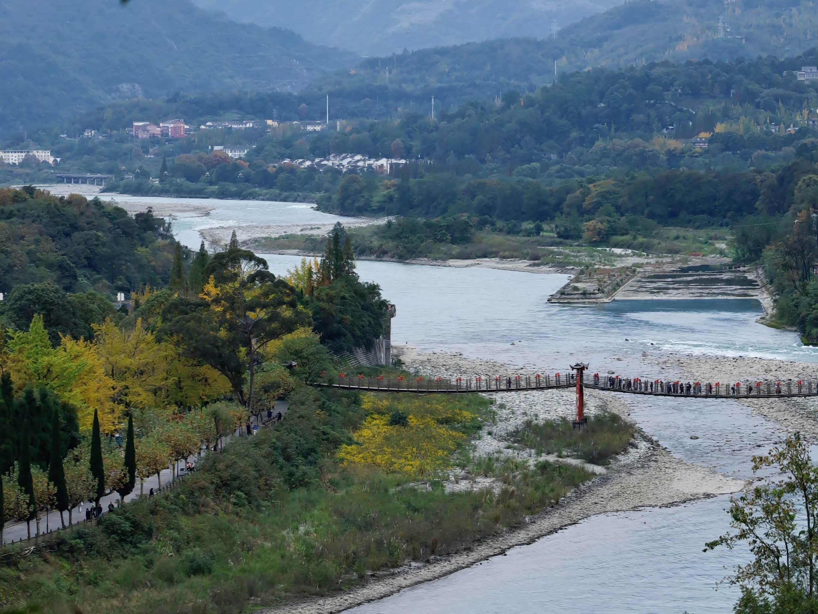 都江堰门票80元,请了个讲解员(100元),不然光看水真看不懂。秦堰楼俯瞰全景时,讲解员说:“这鱼嘴把岷江一分为二,旱时灌田,涝时排洪,两千多年了还在用。”不得不佩服古人的智慧。
