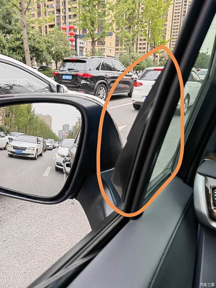 2.后视镜的风噪主要来自于下图这个位置,最可疑的是后视镜和车身的连接件。而不是我之前所说的后视镜本身的迎风面(也就是后视镜外壳)。个人分析是由于后视镜和车身的连接件本身的造型,暨橙色那一块将风剪切之后,恰好把一部分风引到了主副驾驶玻璃靠近A柱那一块地方。