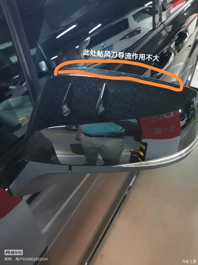 4.大概在两个月前,试着将扰流片贴到过后视镜壳上面,有一些作用,但作用不太大。后来在淘宝里面找到了风刀这么个东西。刚开始也试着在后视镜的上边缘贴风刀,试图把后视镜外壳导流的风往车顶引,但后来发现作用依然不大。那等于几乎可以推翻之前的结论,也就是说后视镜迎风面本身的导流,其实是没有什么大问题的。那造成噪音的,就只有第2点中谈到那一块地方了。