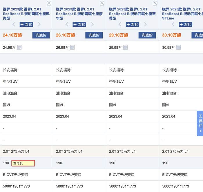刚看了下锐界L ,纯油版185千瓦。混动275马力,发电机190千瓦。