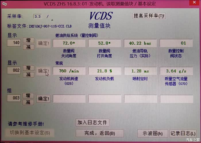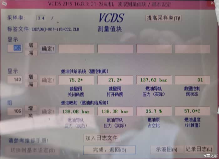 没有去找官方标注的相关参数,从各种论坛网上的资料来看,正常的热车怠速高压油泵压力在40,加油门会上升,松油门会回归到40