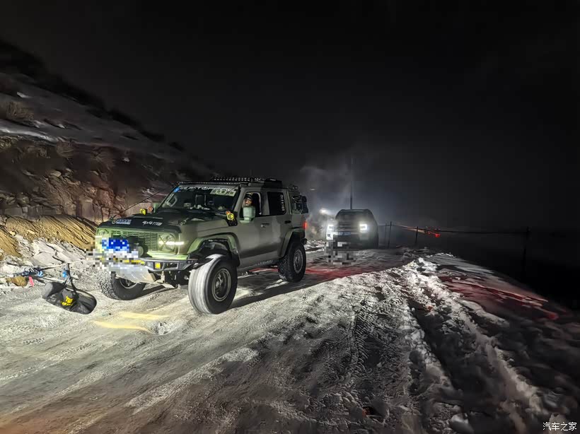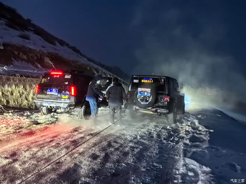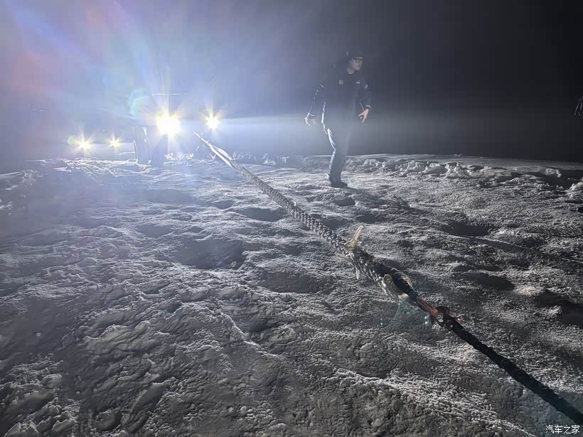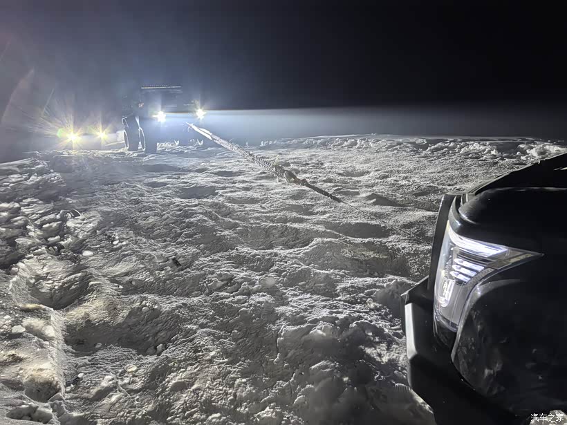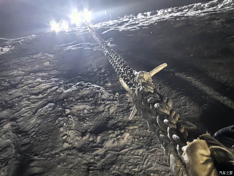 后面再来换上30米长绞盘绳的电马接力,这样即提高了单车手动绞盘、减少串联拖车绳的时间,又保证了停在半坡被拖拽两车的安全,两台绞盘还能轮流休息……对讲机、绞盘电流声、成了寒夜最最繁忙最炽热的交响。