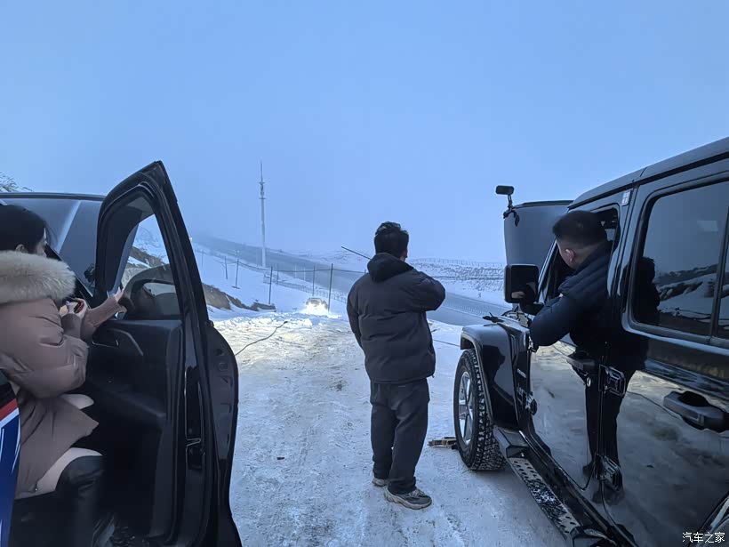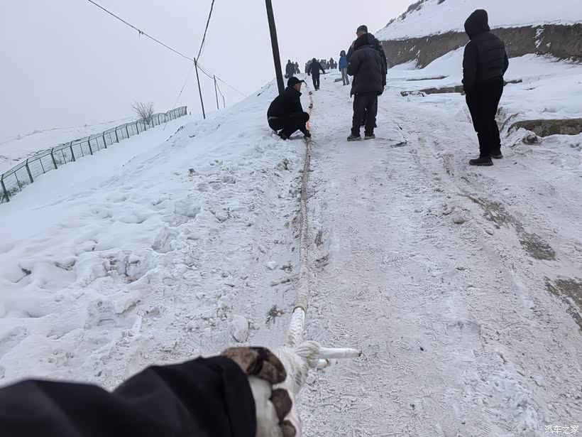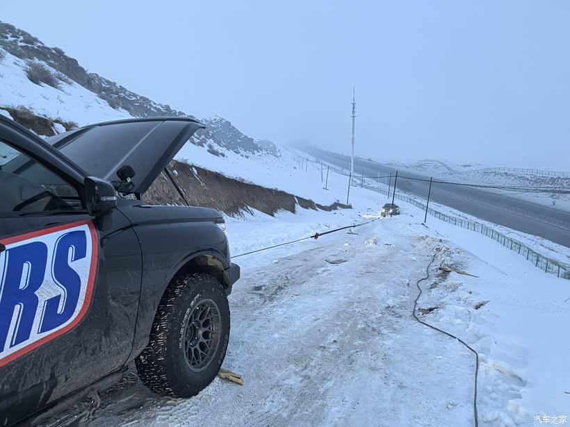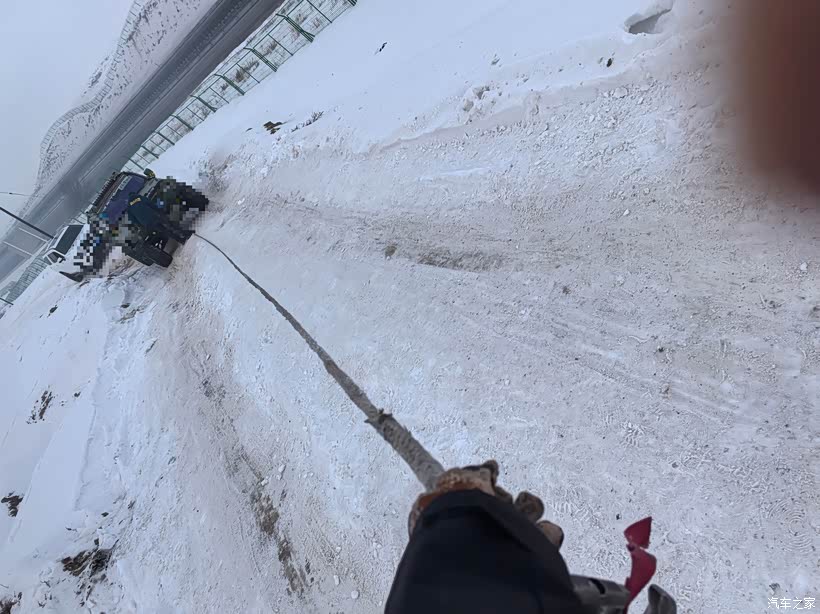 考验又开始了,是如何将这头受伤的野兽从四十米外的冰雪陡坡拖上去。机油倒灌,肯定不能启动,需靠外力拖拽这个没有动力的车子。我们进去车内,用机械钥匙、手钳,一点点通过应急解锁拉手解锁P档位挂入N档。