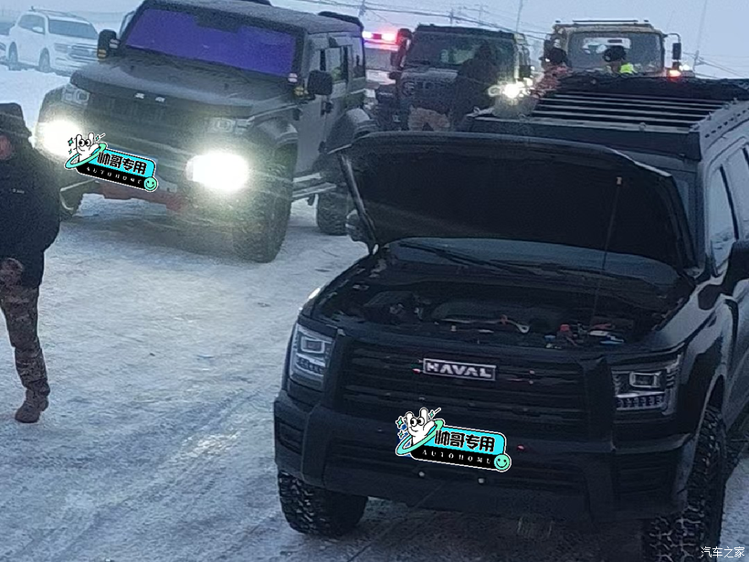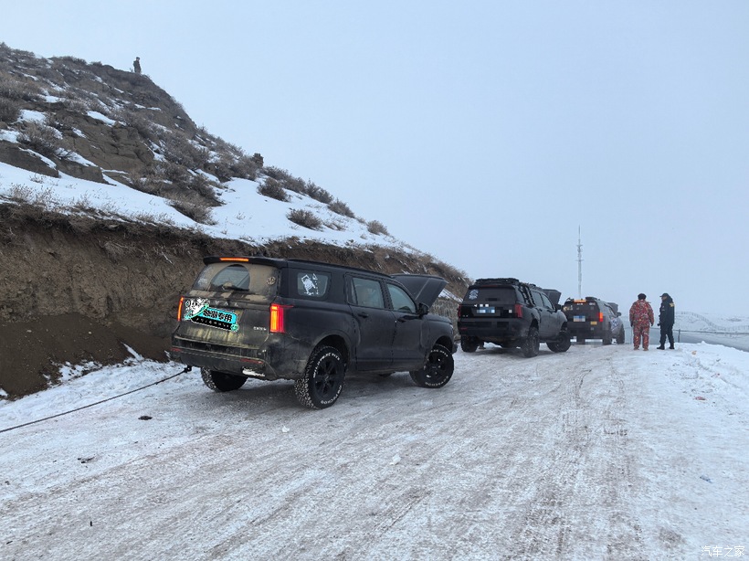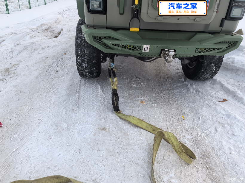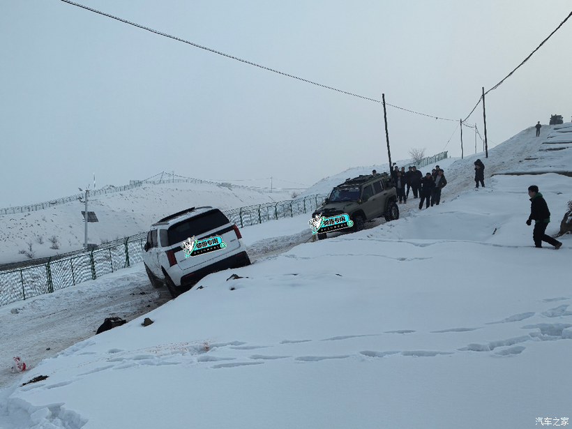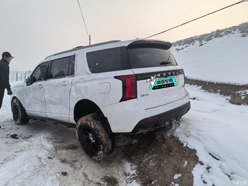 我们把受伤的H5推到一侧,就出位置,坦克300上土丘掉头,然后用拖车带挂住H5尝试冲破拖拽上去,因为路滑,受损的H5不能启动发动机没用动力,冰坡拒绝一次又一次尝试,轮胎空转打滑,甩冰屑渣子却寸步难行。