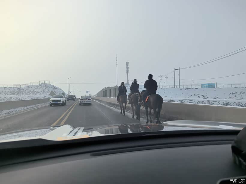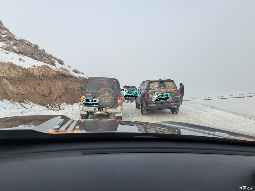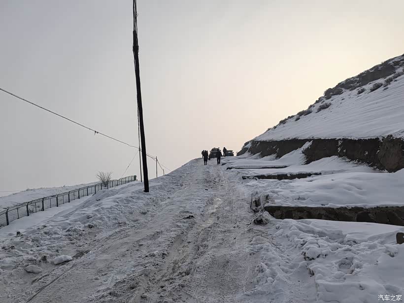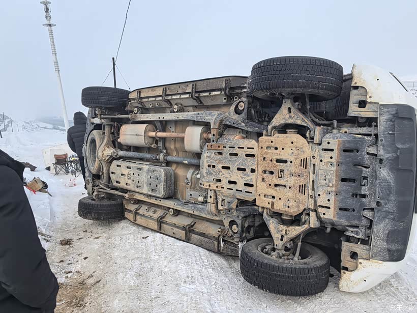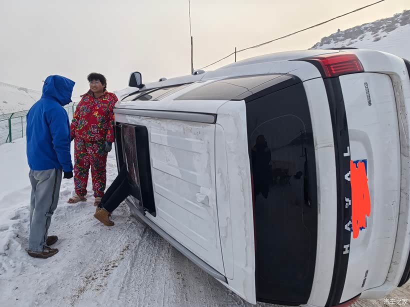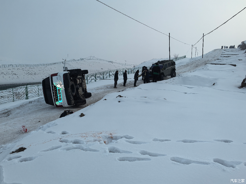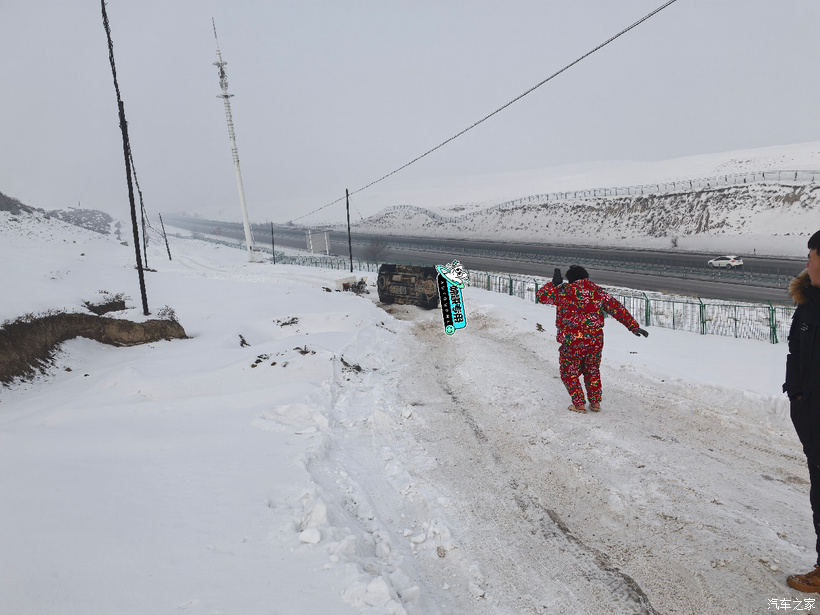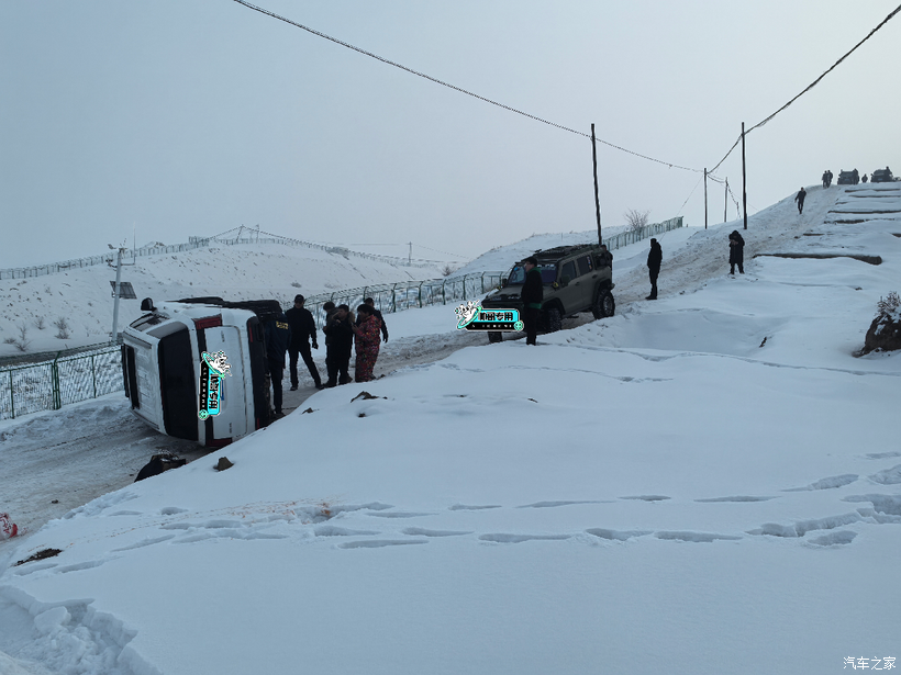 左侧是土坡和高速公路的冰冷护栏,右侧是土丘和满是坑洼积雪的山体。积雪路面之下,是厚厚的暗冰,如同隐陷阱。队友的H5车侧卧于冰面,左侧车身部分凹陷车损,像头受伤的巨兽。人员已从天窗撤离,车身横卧,堵住了牧道。