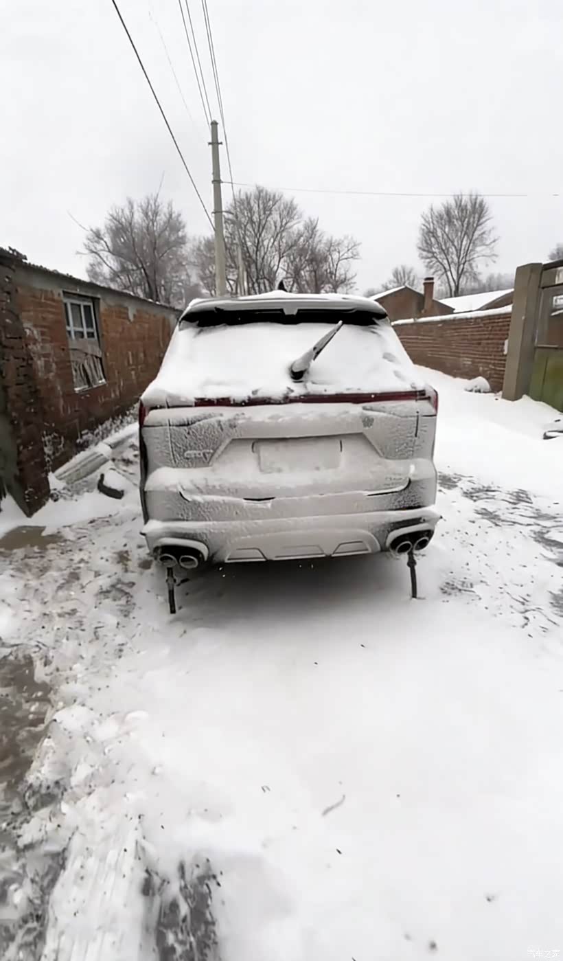 今早推门直接懵了!我的车裹了层厚雪被,黑武士秒变“雪团子”。