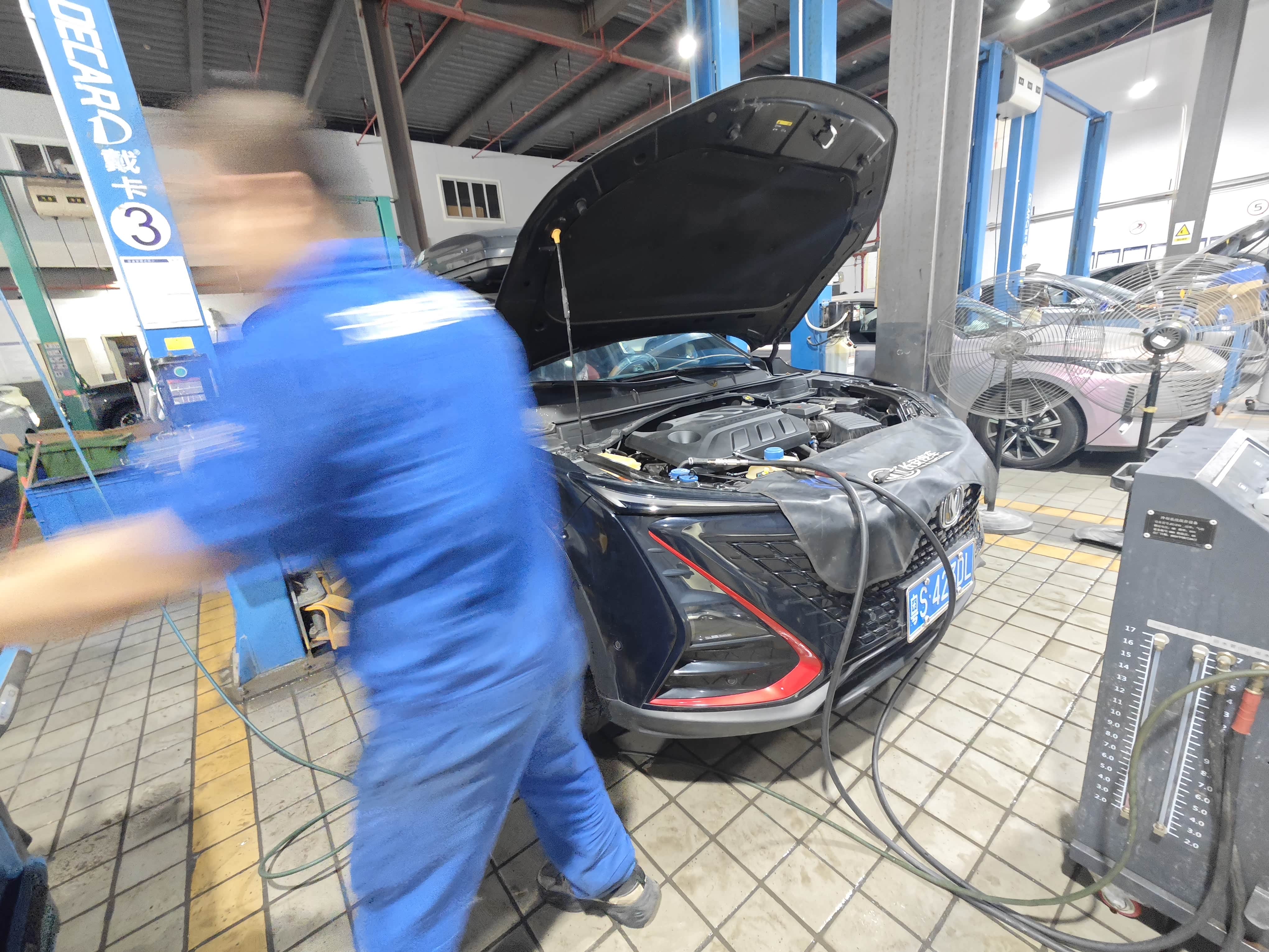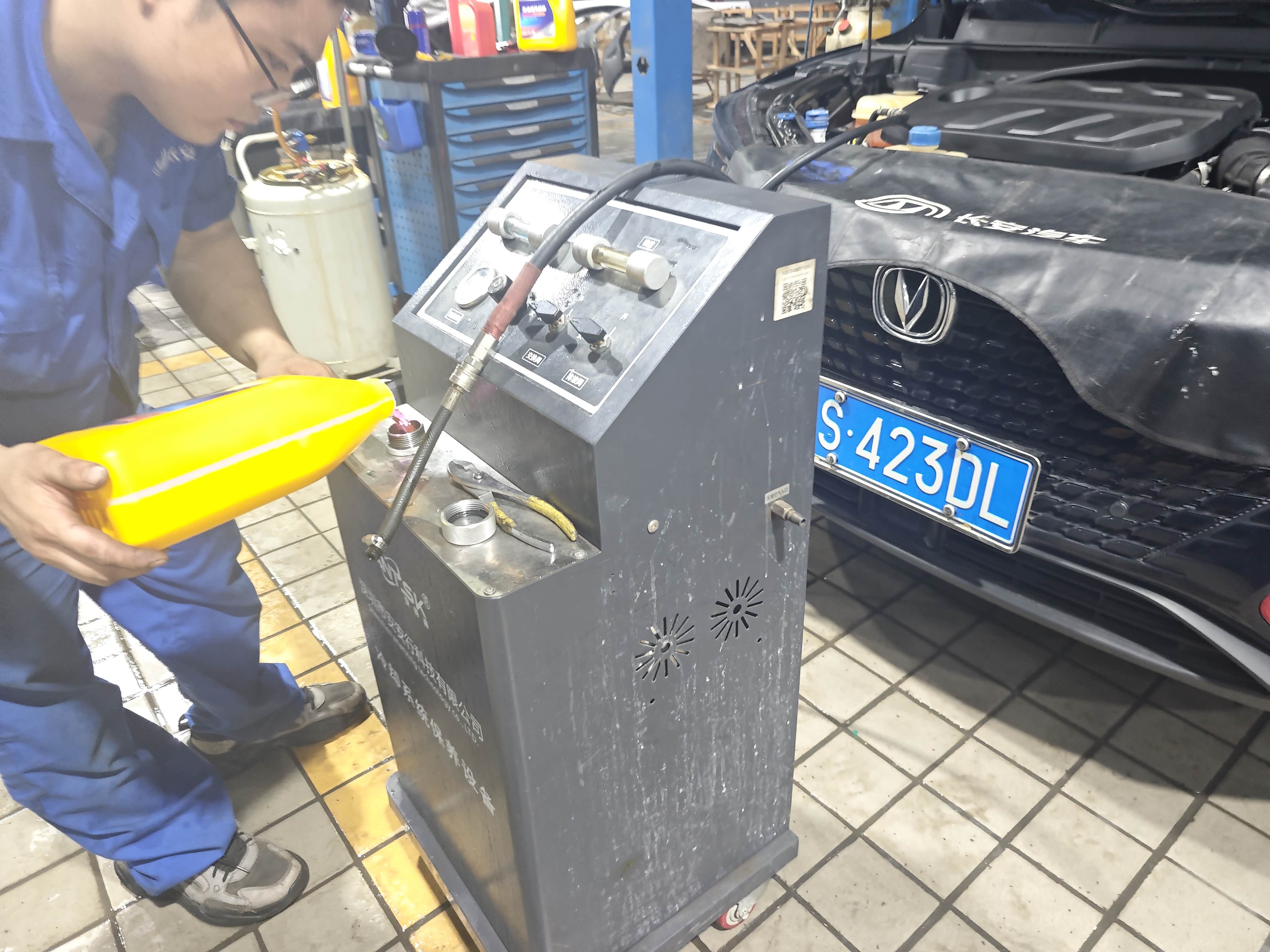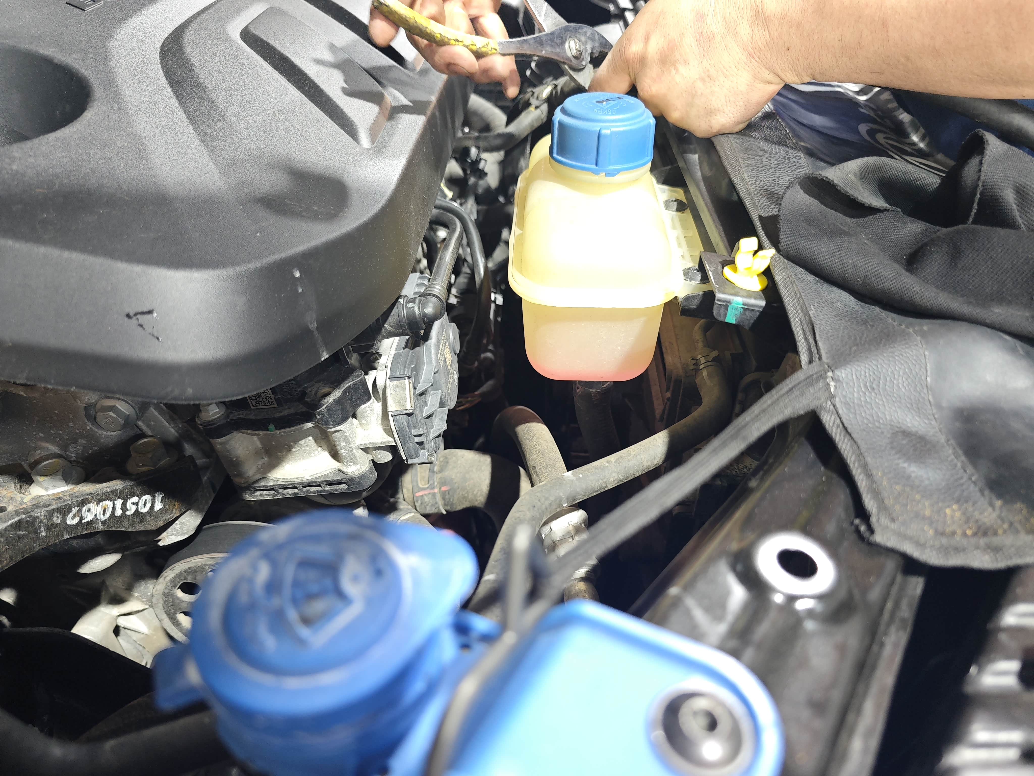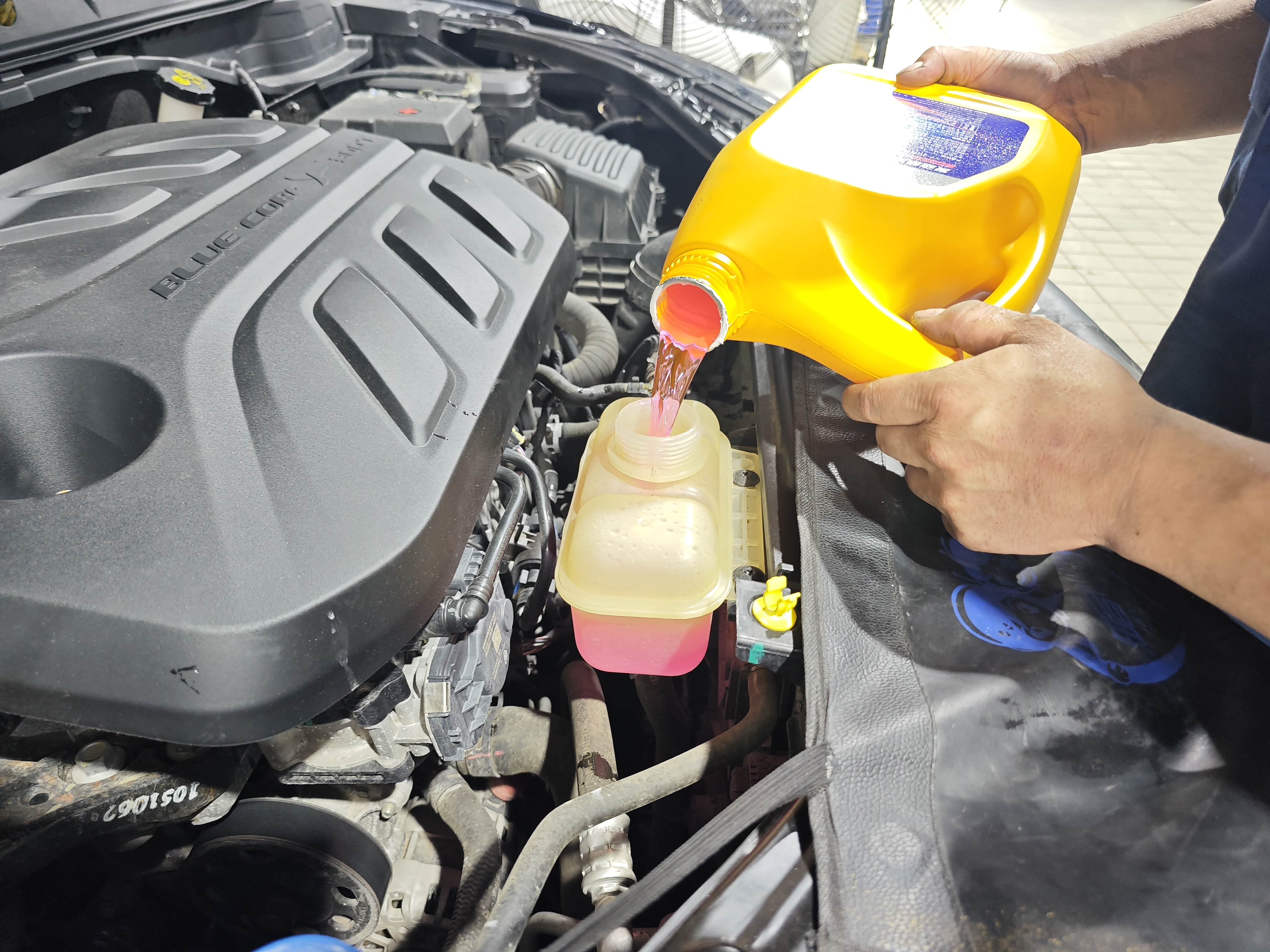 4. 加注新冷却液:先关放水阀,把举升机复位,然后用漏斗往膨胀壶加4L装的新冷却液(必须和原车型号匹配,UNI-T是乙二醇型,粉色),加到“MAX”刻度线下1厘米;接着启动发动机,让冷却液循环,师傅还会轻捏水管排空气(气阻会导致散热不良),最后补加到标准刻度。