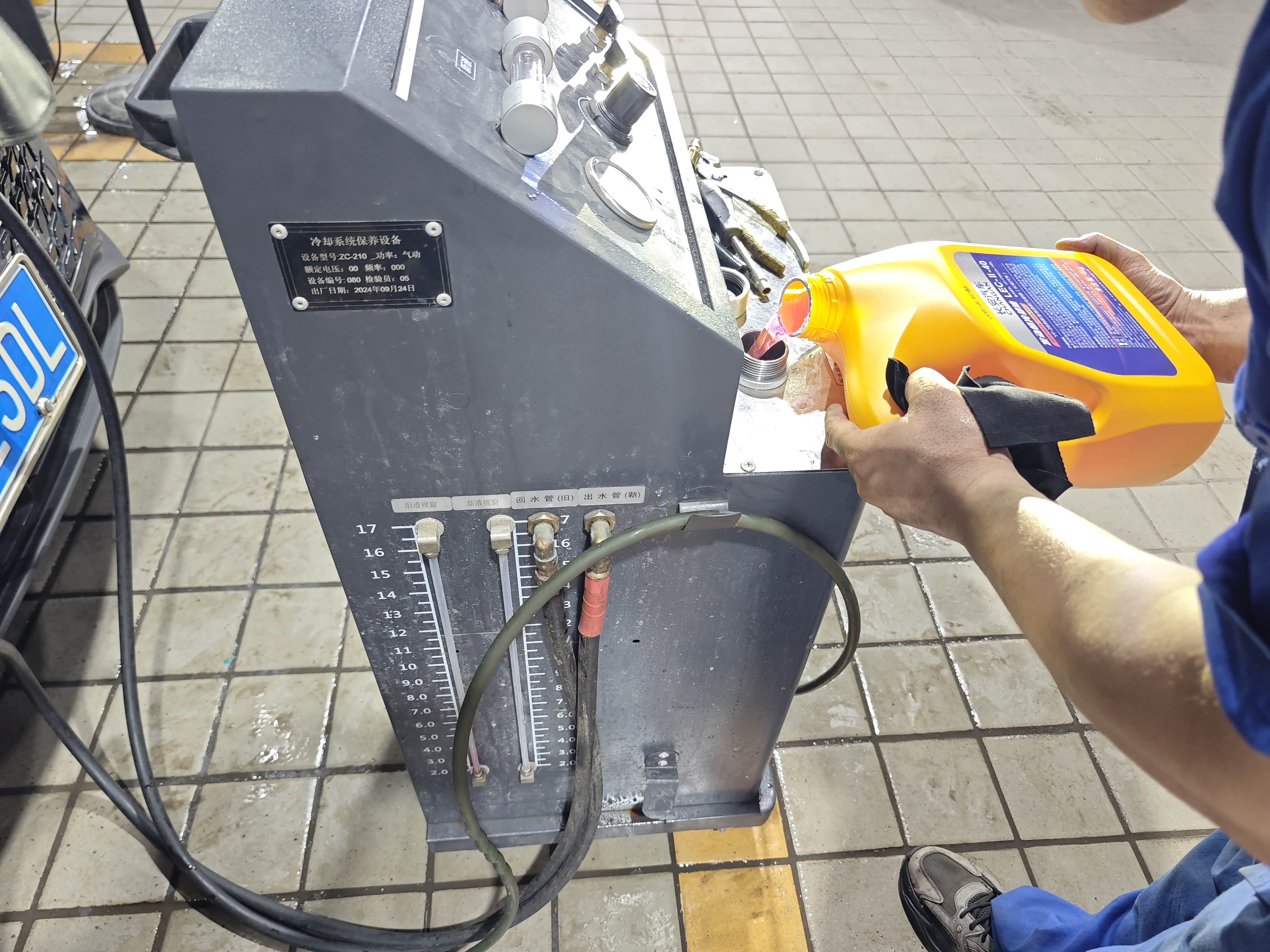 3. 系统清洁(关键步):旧液排完后,师傅往膨胀壶里加了专用清洗剂,启动发动机怠速5分钟,说是冲管路里的水垢和杂质——后来才知道,很多街边店会省这步,杂质残留会污染新液,缩短使用寿命。清洗完再打开放水阀,把清洗剂排干净。
