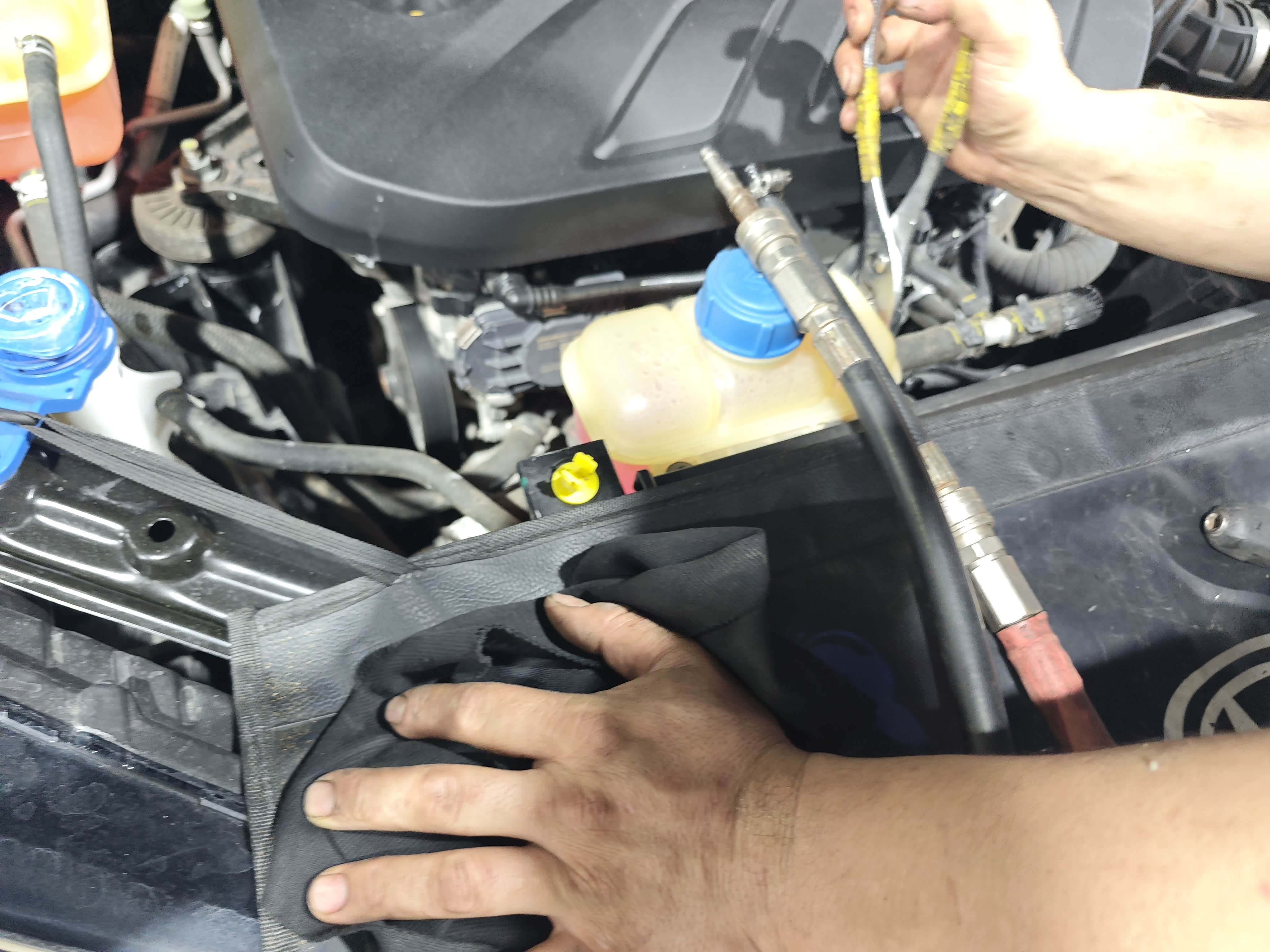 1. 车辆预检:师傅先把车开上举升机,用专用诊断仪查发动机故障码,再仔细看冷却管路——胶管有没有变硬、接头处有没有冷却液结晶(这是渗漏前兆),确认没问题才开始操作,避免拆完发现其他问题返工。