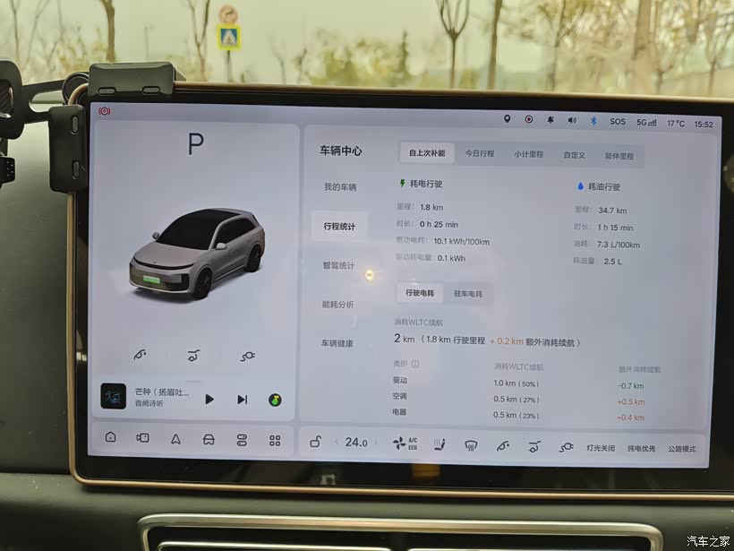 能耗方面理想有点小动作。一开始只关注驱动电耗(表显很低,夏天10-15,冬天15-20)。但实际要看综合电耗(含空调、电器等),这才是真实水平:夏天在15-20,冬天开暖风会到25-30。油耗表现在预期内,综合路况基本稳定在6.5-7L/100km,高速就算速度快点也能基本保持在7.5以内,对于这么大一辆车,已经非常满意了。