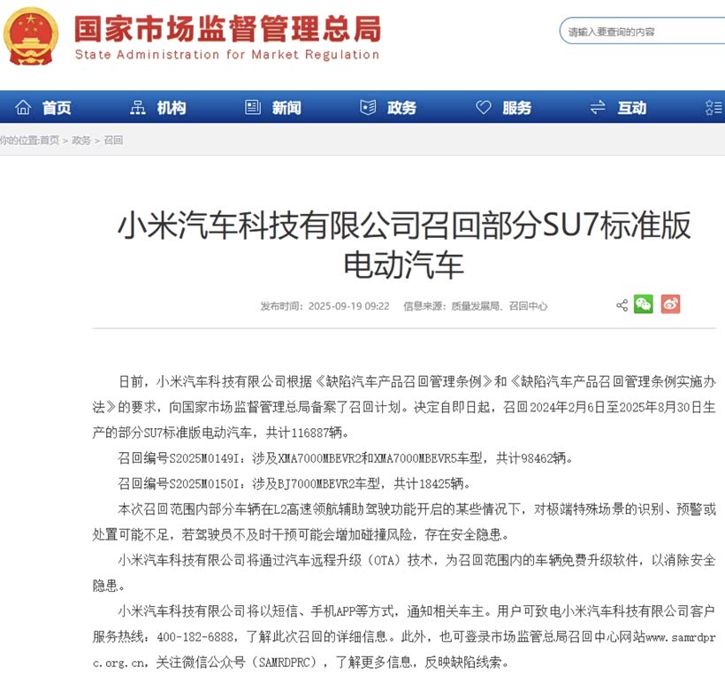 说实话,看到小米召回近12万辆SU7的新闻时,让我想起了去年安徽高速事故的旧闻——三位大学生的生命,最终变成了新国标里1:1复刻的“施工区探测试验”。这次召回编号尾缀的“I”(受调查影响),像根细刺扎在“OTA升级”的糖衣上:不是车企主动认错,而是监管扒开了“智能驾驶”的遮羞布。