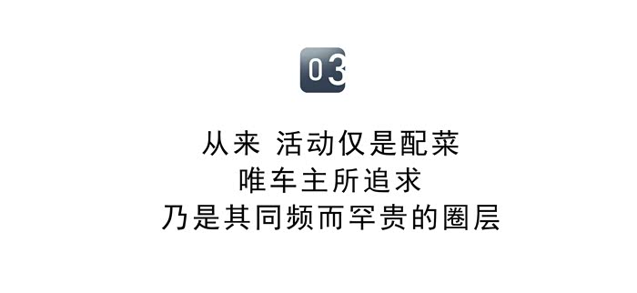 普遍车主来说,较年青较精英的一群,生活多样而精彩,正所谓什么菜未吃过,什么品牌未接触过,什么活动未玩过呢,所以在群体活动中,除非十分创意与新鲜,限量或私属的派对,他们其实不愁欠缺什么。其实更吸引的,是相等背景而且同频的朋友圈子,在阅历,价值观,生活感悟上都能有共鸣,才是精髓所在。