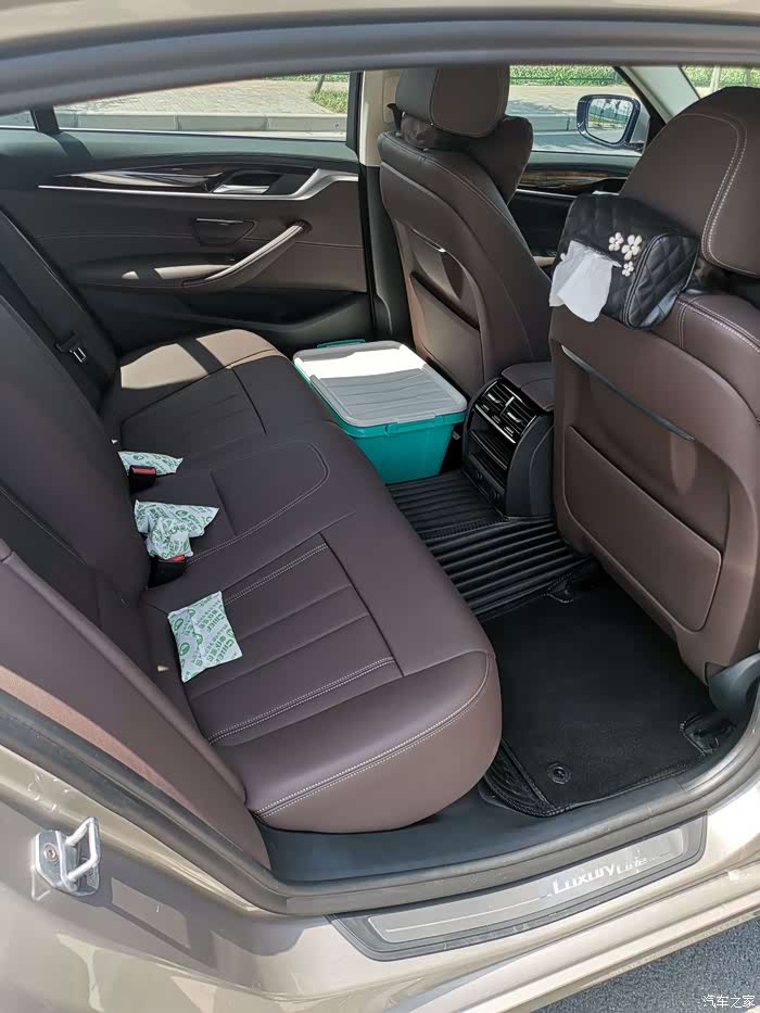 接下来说说空间,相信大家都知道,上一代君威的空间一直是被人诟病的焦点,4米83的车身,坐进去如同紧凑车一般。尤其是后排空间,头部和腿部都很局促。没办法,谁让这车的外观这么圆润这么优美呢,车顶弧度大,近似coupe的造型,典型的为了造型牺牲了空间。而5系则是出了名的大,车体大,轴距大,内部空间也大。前排调到合适位置,后排轻轻松松二郎腿。而且座椅长度和靠背厚度并没有缩水,实打实的大。不过我个人有个感觉,这一代的5系空间似乎比上一代的略有不如,曾经有机会坐过上一代的5系,那后排简直了,当时带来的震撼比自己提车后的直观感受要强烈。不知道有没有车友能提供实际数据,也许可以印证两者之间的微小差距。