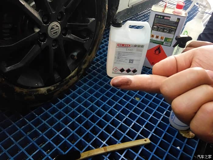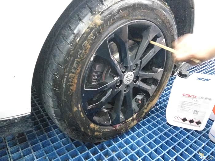 先在四个轮胎喷上轮胎轮毂清洁