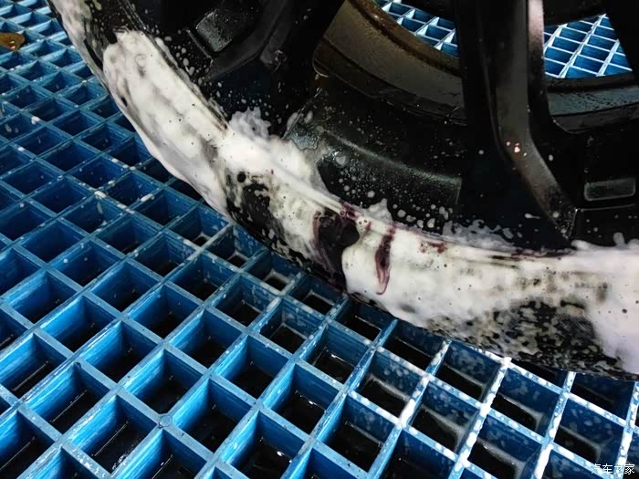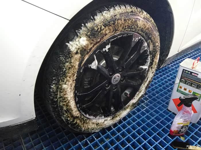 平常都以为洗车轮毂用泡沫洗一下,海面擦一下就完事了,用专业的产品洗过之后才知道效果,上图轮胎下方紫色的分解物就是轮毂上附着的铁粉,下图有特写