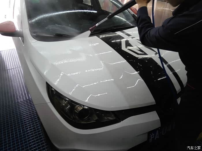 车身全部冲洗干净之后,喷上车身护理水蜡,静置几分钟后用抹布擦干车身,死角用气枪吹干