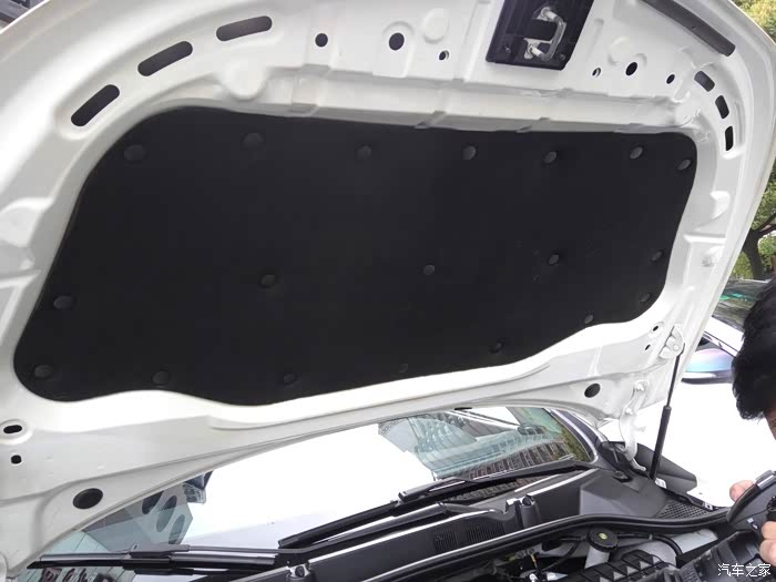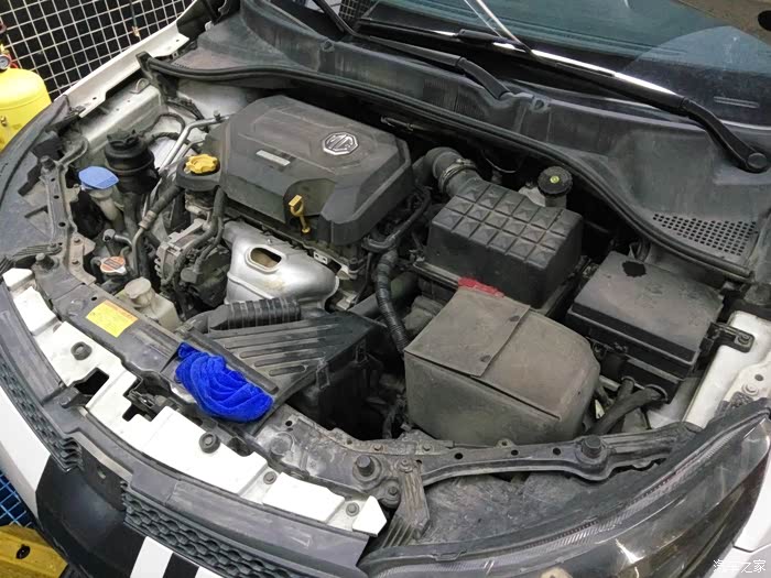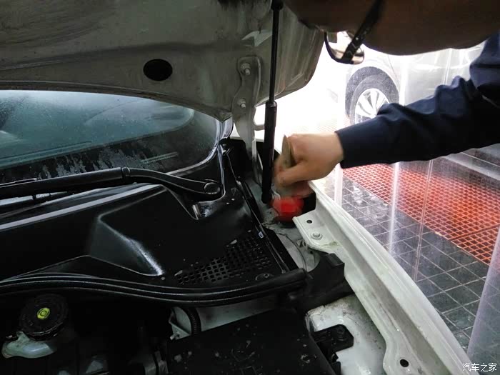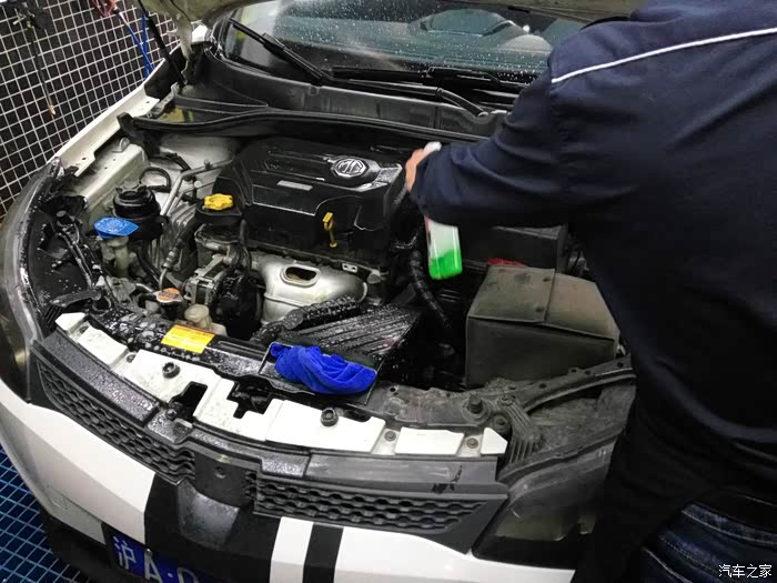 先在引擎室和机盖上均匀喷洒引擎清洁剂,稍等几分钟让清洁剂分解污垢,然后用软毛刷刷洗细节部位和死角,下图1是未清洗之前的样子,我平时有时候会自己下去擦洗一下,只不过这次已经有一段时间没擦洗拉,请注意在进气口塞住的蓝布,许多美容店家贪图方便没有做这一步,很有可能导致清洁剂和水倒灌,造成缸内进水,如果做引擎室清洁一定要这一步操作,切记!!
