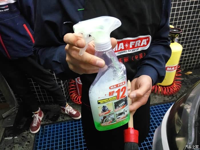 师傅先将轮胎清洁剂喷在轮胎周围一圈,再喷上轮毂清洁剂,喷上清洁剂后,静置1-3分钟,清洁剂会自己溶解轮胎上的油泥和轮毂上的铁粉,再用轮毂专业刷清洁轮毂内侧,