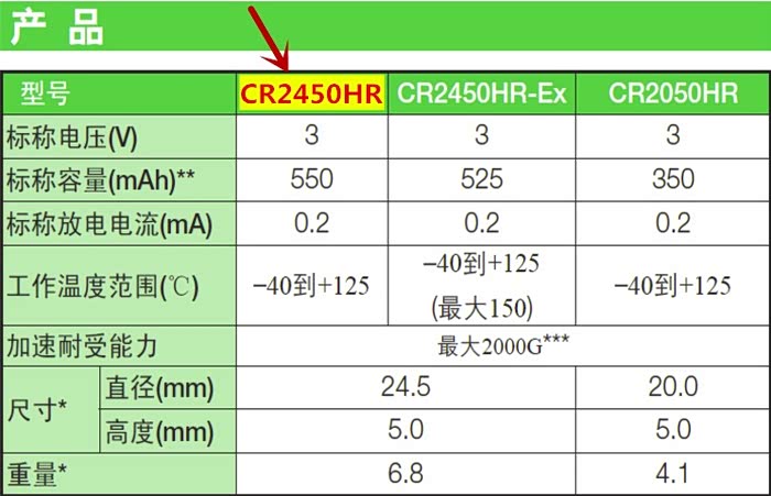 电池型号:CR2450HR EX,用CR2450HR也是可以的,尺寸一样