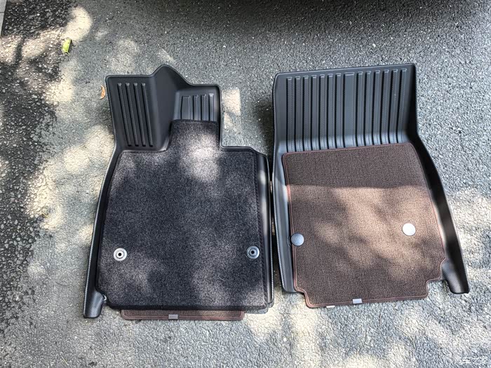 tpe 脚垫加绒垫,左边黑色的绒垫是 4S 给的,质量一般。右边是 tpe 脚垫配套的绒垫