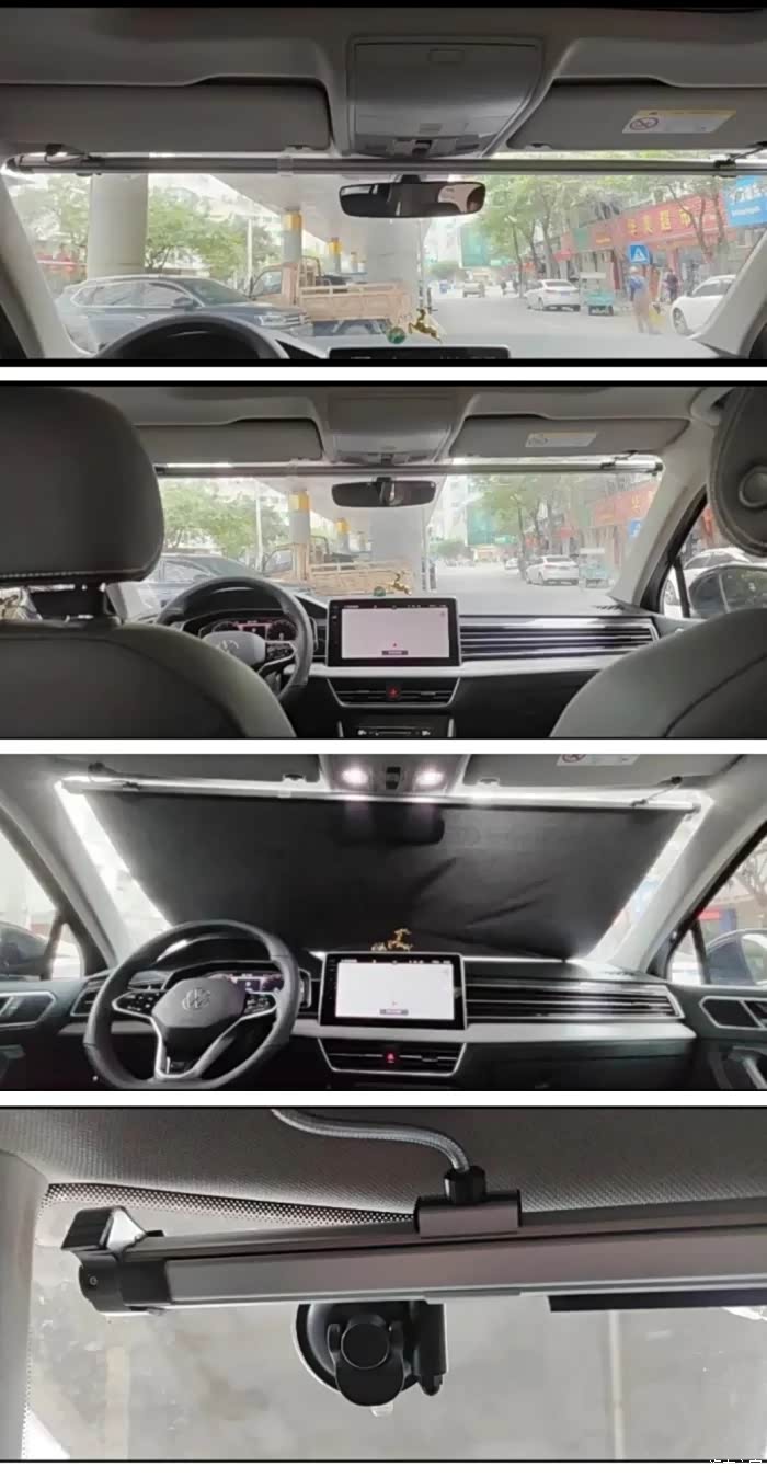 11、自动伸缩前挡遮阳帘。轻轻一拉,可以遮满前挡,夏天很实用;一键自动回收,不影响行车视野。