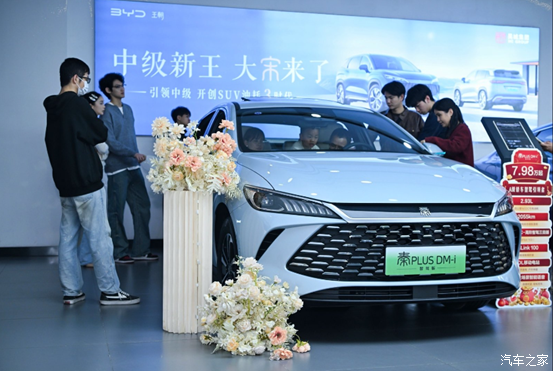 刚进4S店就惊了,人挤得跟菜市场似的,销售小哥忙得满头大汗,看来这第二代秦PLUS智驾版是真火啊。车头那龙睛大灯闪得人挪不开眼,直瀑式格栅配上汉字标特有排面,轮毂线条和溜背车尾也够讲究,停那儿跟隔壁的合资车一比,瞬间觉得这车标都透着文化自信。