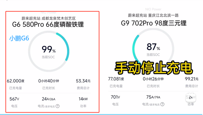小鹏G6:66度磷酸铁锂电池,13%到100%用时40分钟,充了57.5度电;