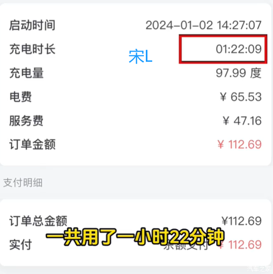 宋L:87度磷酸铁锂电池,从0%到100%用时1小时22分钟,充了87度电;