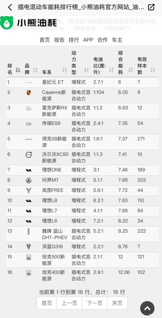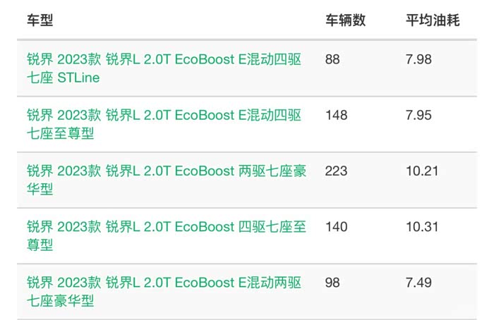 再来看看小熊油耗上,中大型插混SUV的车主众测油耗。按我的锐界L混动7.66L 的实测百公里综合油耗,可以排到第八名,把问界M7顶下去。如果按照车主众测的锐界L混动两驱7.49L的百公里油耗,同样可以排到第八名,把问界M7打下去。插混的油耗还不如油混,你插混个啥?