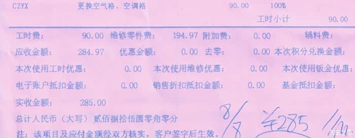 这一次保养,我还更换了空调格和空气格,工时90元,材料费195元,合计285元。我知道去网上买材料回来自己动手换更便宜,但太麻烦了,况且网上便宜很可能会买到副厂件。再说了,跑6万公里就自己掏钱换了两次空调格和空气格,平均3万公里换一次还不到300块,没啥好纠结的。除了这两个格,目前6万公里的锐界L混动,除了加油之外,其它方面还没让我花过一分钱(保险、洗车、打蜡等项目因人而异,不计算在内),你还觉得这个中大型油电混动SUV的维修保养贵么?