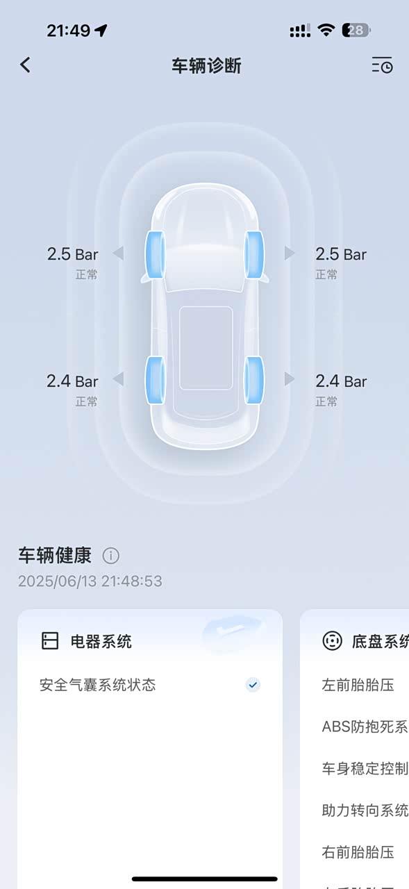 五、车辆的胎压:夏天温度高,胎压过高容易爆胎,过低则会增加油耗。按照车辆保养手册建议,把胎压调整到合适数值2.5左右,开起来更安全、更经济。