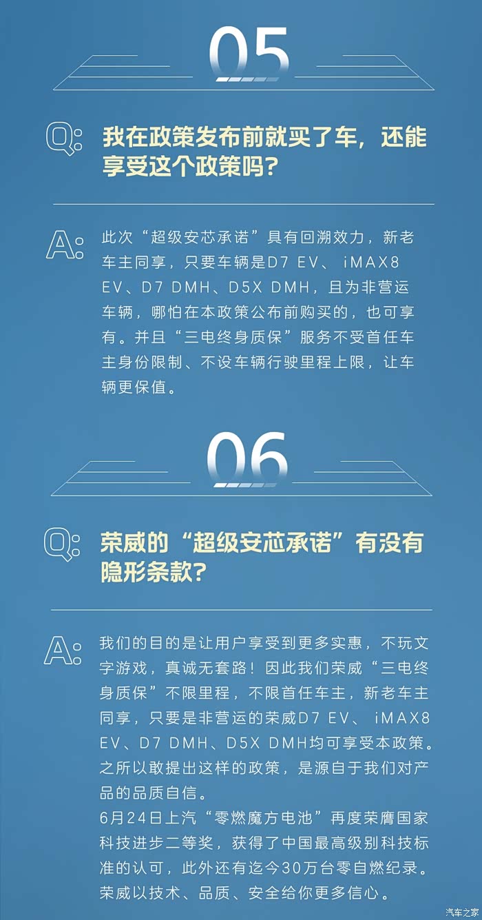 更为亮眼的是,荣威的三电终身质保政策,涵盖了高压电池包、驱动电机、驱动电机控制模块等关键部件,甚至包括混动车型的动力总成集成控制模块,且不限首任车主和年行驶里程。这意味着无论车辆转手多少次,质保权益都将随车延续,极大提升了二手车市场的吸引力和车辆的保值率。