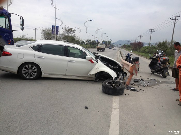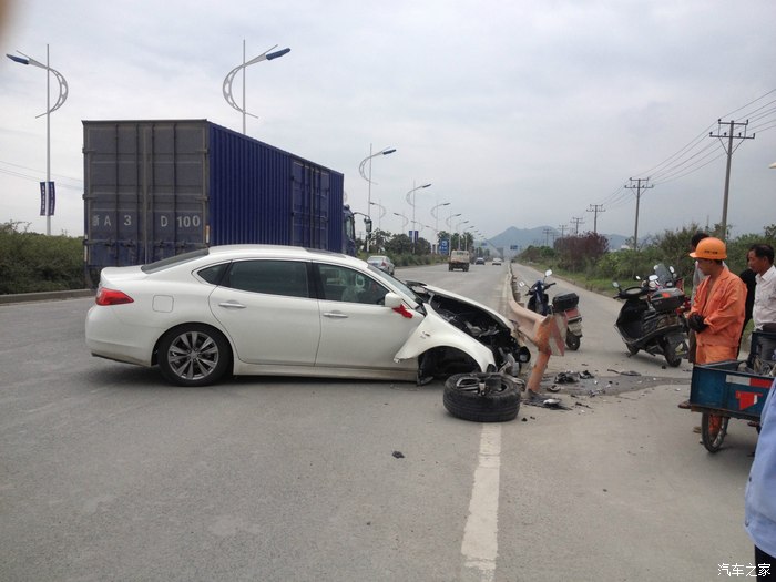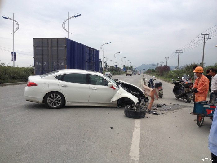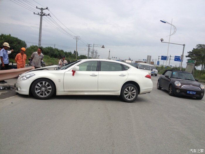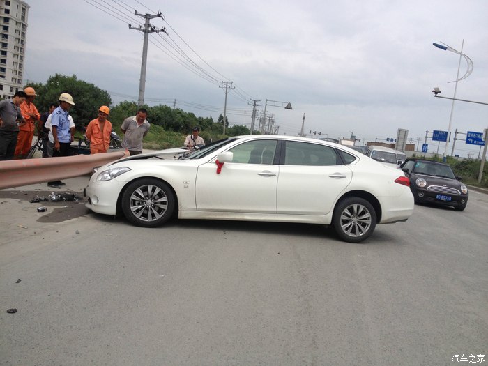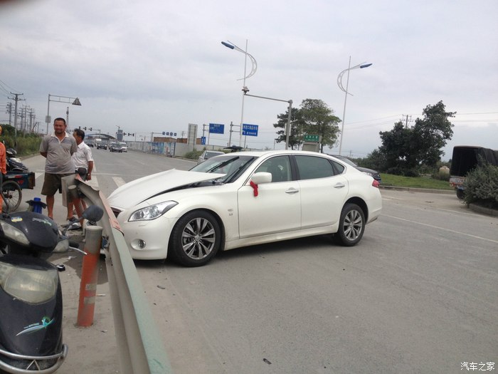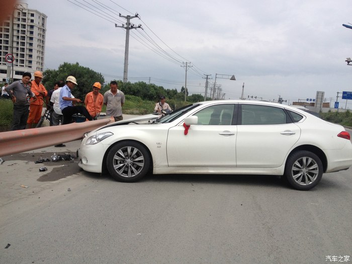 本人在温州开店顺带接点小工程,赚点小钱,英菲尼迪Q70L是我真正意义上的第三部车子,之前做过详细的购车攻略在这里就不再详述了.事情发生在9月14号中午.那车子提过来才一个星期左右.准备第二天上牌照的.那段时间不是知道怎么回事,精神萎靡不振,晚上睡不好,白天困死.中午刚吃了饭,工地打电话让我过去处理点事情.我在半醒半睡中,洗了脸就开车出去了.下了高架的时候,沿着修路的滨海大道,不知道什么时候打了个盹.当自己醒来的时候,新提的英菲尼迪Q70L以80时速(恍惚中好像开了定速)撞在路边的护栏上.看着安全气囊完全爆开,安全带抱死.迷魂的自己顿时清醒了,才发现自己出了事故.下车后看到自己心爱的小鹰惨剧的躺在路边,心都碎了.第一时间打了报警电话和保险公司.然后自己不停的拍照片,等候处理.