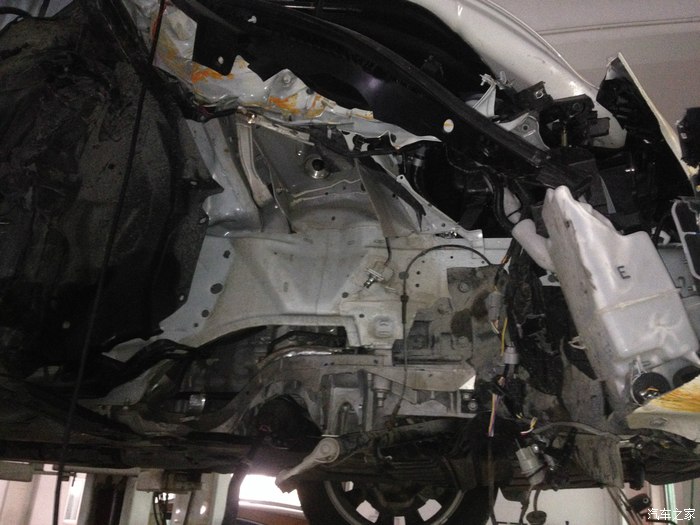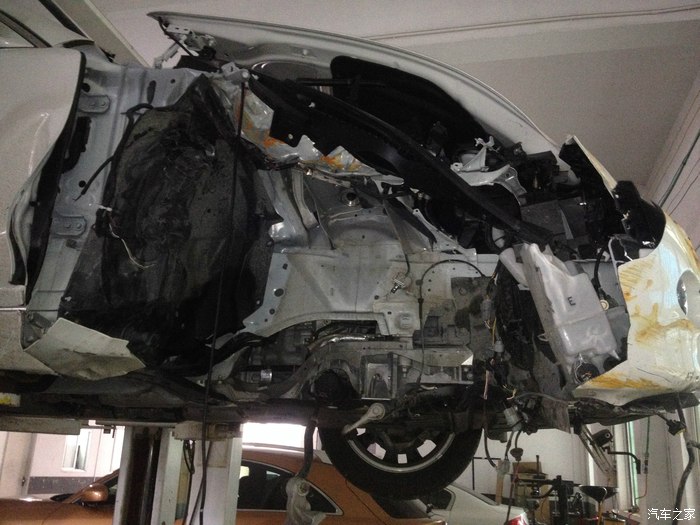 汽车右边几乎全部报废.大梁地盘也有变型.